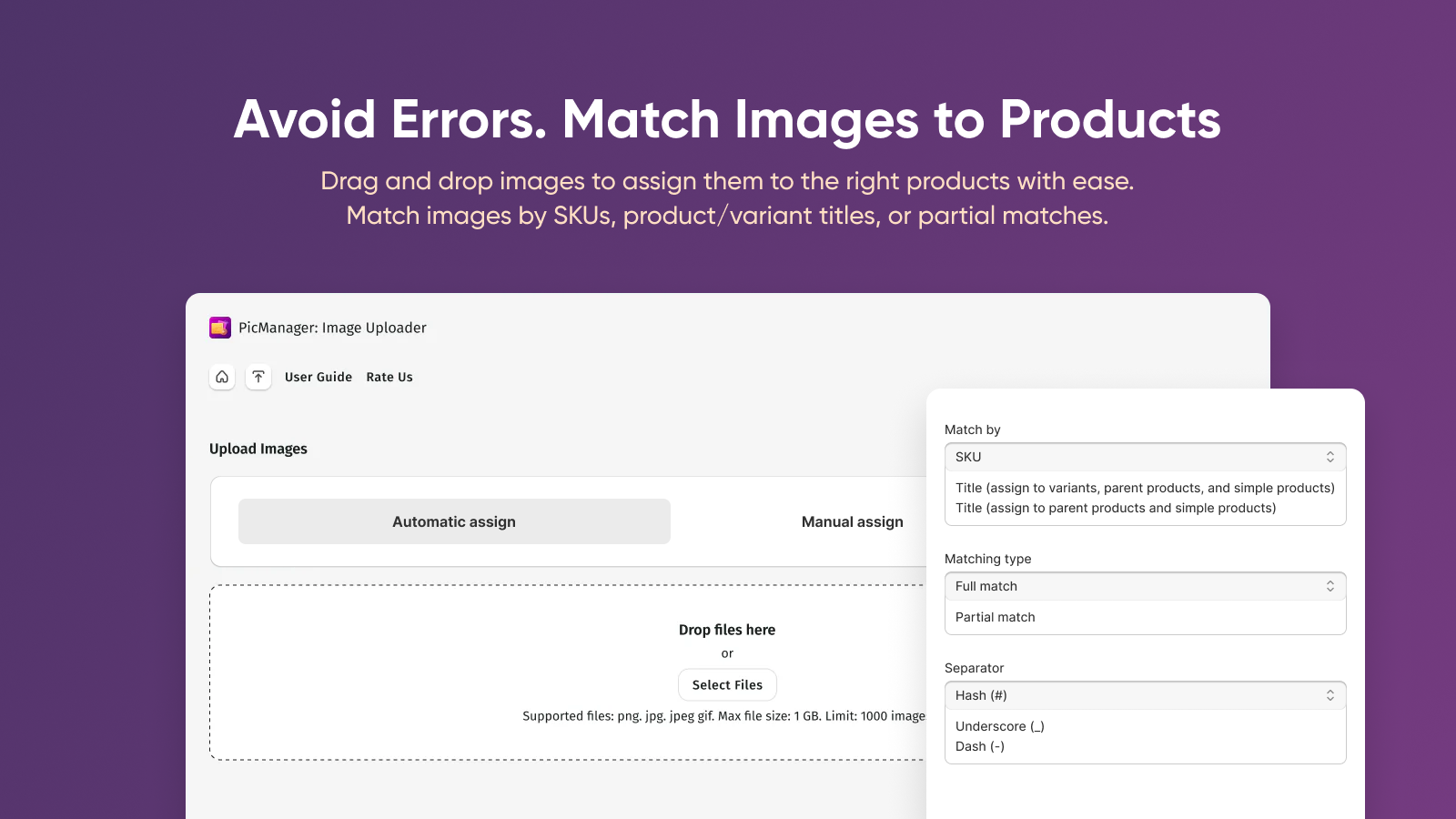 Make uploading product images super easy! Upload pictures in bulk manually or with a ZIP file. Quickly assign images and add multiple to one product in just one step using drag-and-drop. Keep everything organized with a detailed log report tracking each images upload status. Ensure bulk add images accuracy with a photo matching validator and enjoy a simpler way of handling your images!