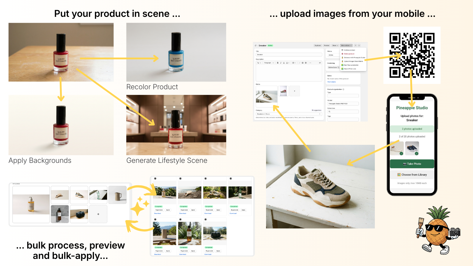 Create professional product images without design skills or photoshoots. Replace backgrounds, place products in lifestyle scenes, or generate color variants — all in seconds. Snap photos from your phone with Mobile Upload. Process hundreds of images in bulk. Preview first, originals always safe. Ready-to-use templates mean no prompt writing needed. Just pick a template, configure your settings, and get results in 10-30 seconds.