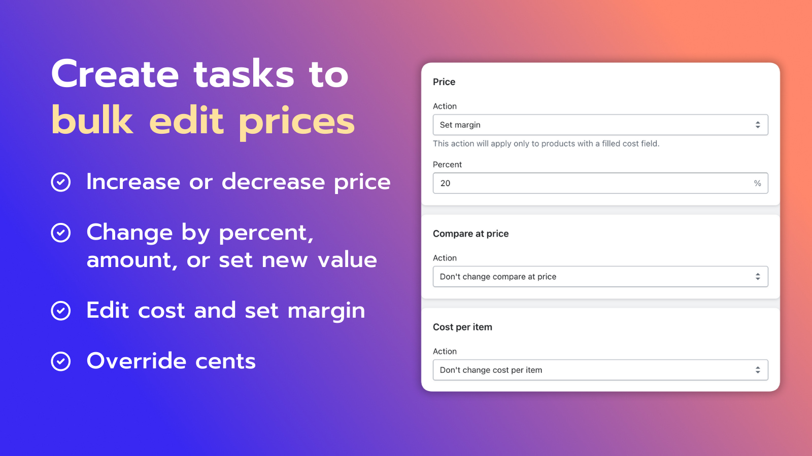 With Bulk Price Editor you can easily bulk edit prices in your store and run scheduled sales. Forget manual updates and messing up with CSV. Specify the change you want to make, select collections or products and we'll handle the rest. And don't worry - we have a backup for every change we make so you can rollback in one click. The app allows you to edit price, compare at price, product cost and set margin. You can use the app to run scheduled sales that will start and stop automatically.