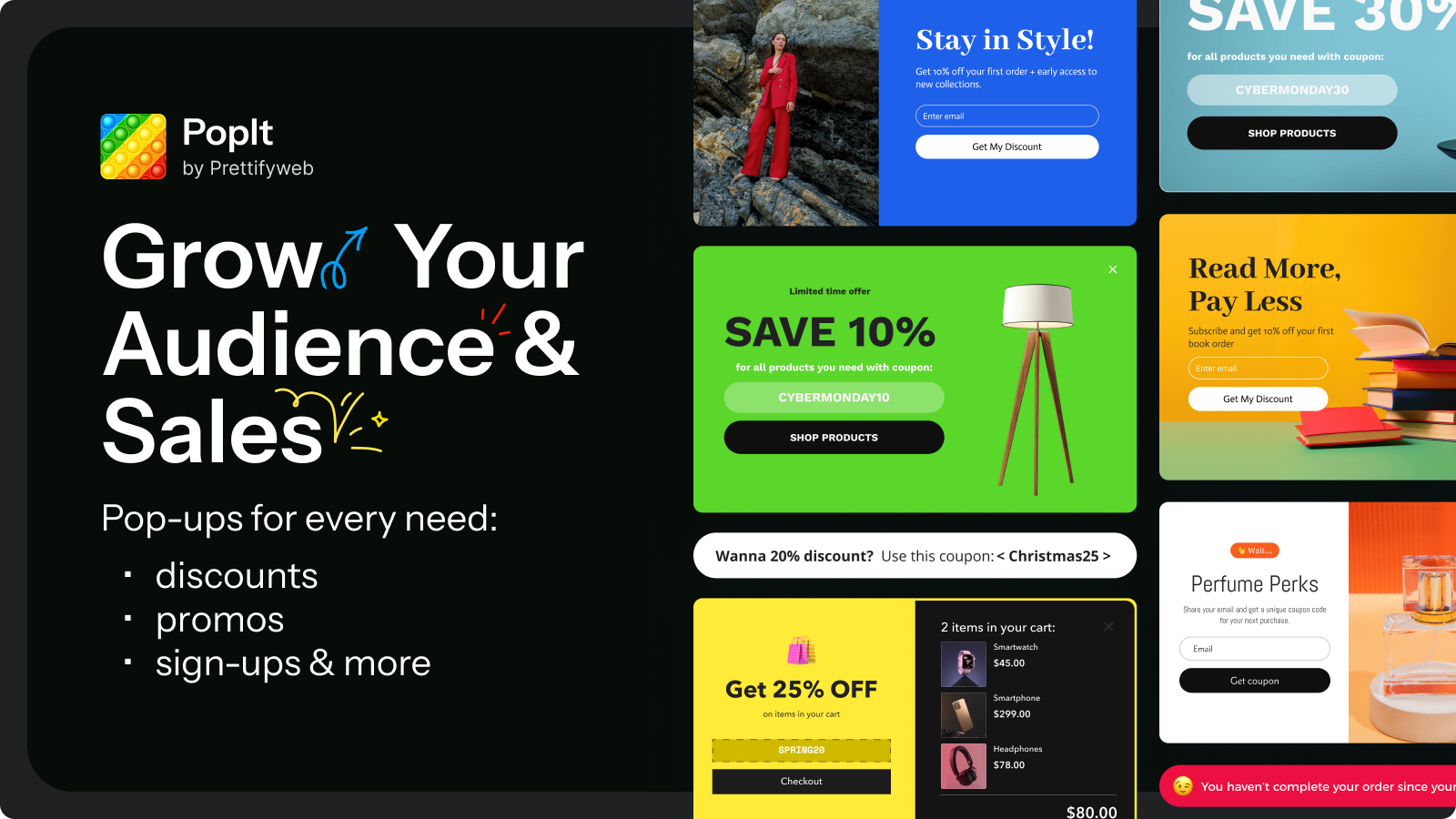PopIt helps you grow your email list and boost sales with high-converting popups. Create beautiful email popups, discount offers, newsletter sign-up forms, and exit-intent campaigns — no coding needed. Pick a ready-made template, customize it, to match your brand, and launch in minutes. Target popups by page, product, collection, and device. Set smart triggers: time delay, scroll, exit intent, and click. Reduce cart abandonment with targeted coupon pop ups.