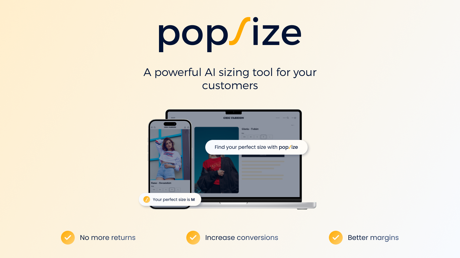 Popsize solves one of fashion e-commerce’s biggest challenges: sizing uncertainty. By combining our proprietary AI models, real shopper profiles and brand-specific data, we deliver personalized size recommendations that reduce return rates and improve the shopping experience. Popsize can be set up in 2 minutes, integrates seamlessly with your storefront, and helps provides you with reliable size guidance directly on product pages.
