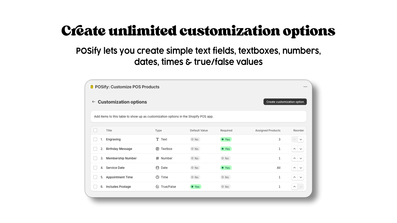 Easily capture important product customizations — like engravings, membership codes, or personalized messages — during the Shopify POS checkout. Staff can quickly select products, provide the customization, and add them to the cart in just three taps. Customizations are stored as line item properties, ensuring visibilty in reciepts and reports. Staff can also select their favorite products for quick selection, saving precious time when selling via POS.