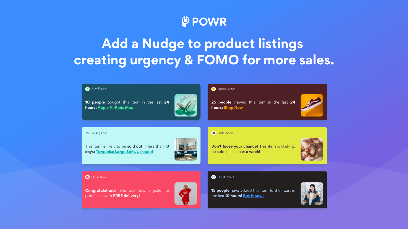 The POWR Nudge app is a quick and easy way to improve conversion rates, trigger a sales action, and speed up buying urgency. Use FOMO (Fear Of Missing Out) marketing to improve close rates and reduce cart abandonment. The Nudge app uses your real-time inventory counts to move more stock faster. Here are some ideas: Now Popular, Selling Out, Overnight Delivery, Order Within 2 Days. Show how many items are left, sold, and more. Create scarcity for better shopper engagement.
