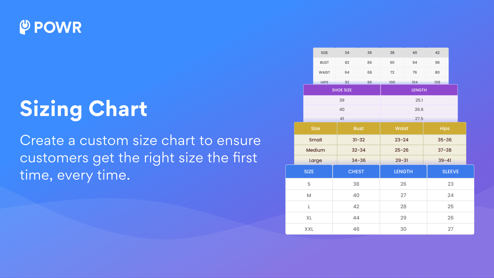 Reduce returns and support calls + get more sales with an easy product size chart, size guide.
