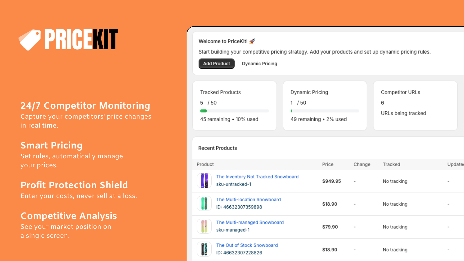 PriceKit automates competitor price monitoring and dynamic pricing. Track competitor websites for price changes and automatically adjust your product prices based on customizable rules. Set conditions to price below, above, or match competitors using min, avg, or max values. Built-in cost protection keeps your margins safe. Stock filtering ignores low-inventory competitors. Each product can have a minimum price floor. The dashboard shows tracked products, active rules, and recent changes.