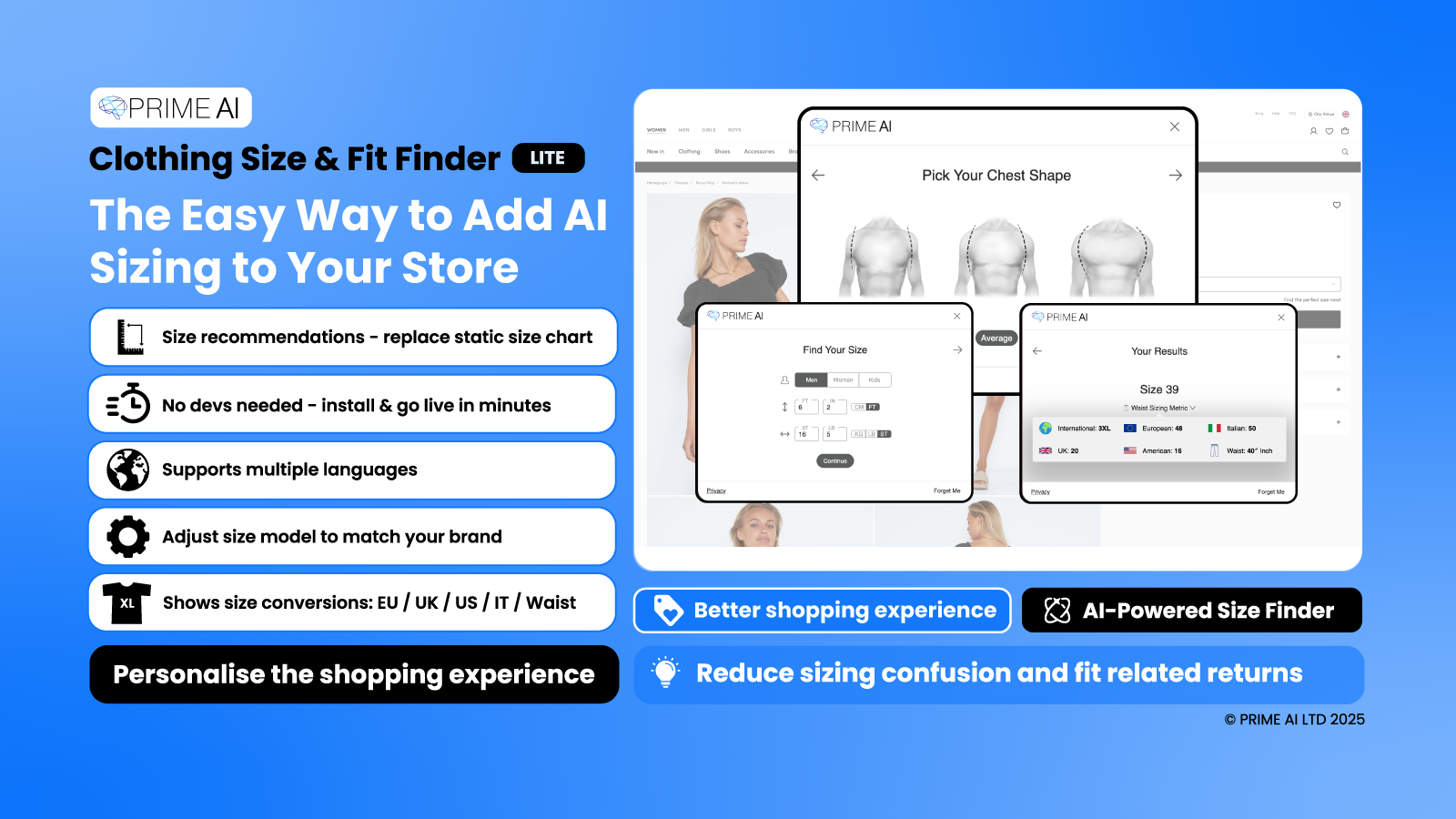 The Lite version of Prime AI’s Size Finder, eases size decisions for shoppers, helping them buy with confidence. It’s ideal for small fashion retailers, replacing static size charts with a smart tool that uses simple inputs to estimate body dimensions. By recommending the size quickly, it boosts conversions, increases profitability, fewer refunds and builds customer loyalty. If seeking for a totally customisable solution or a PRO version of Clothing Size Finder technology, contact us now.
