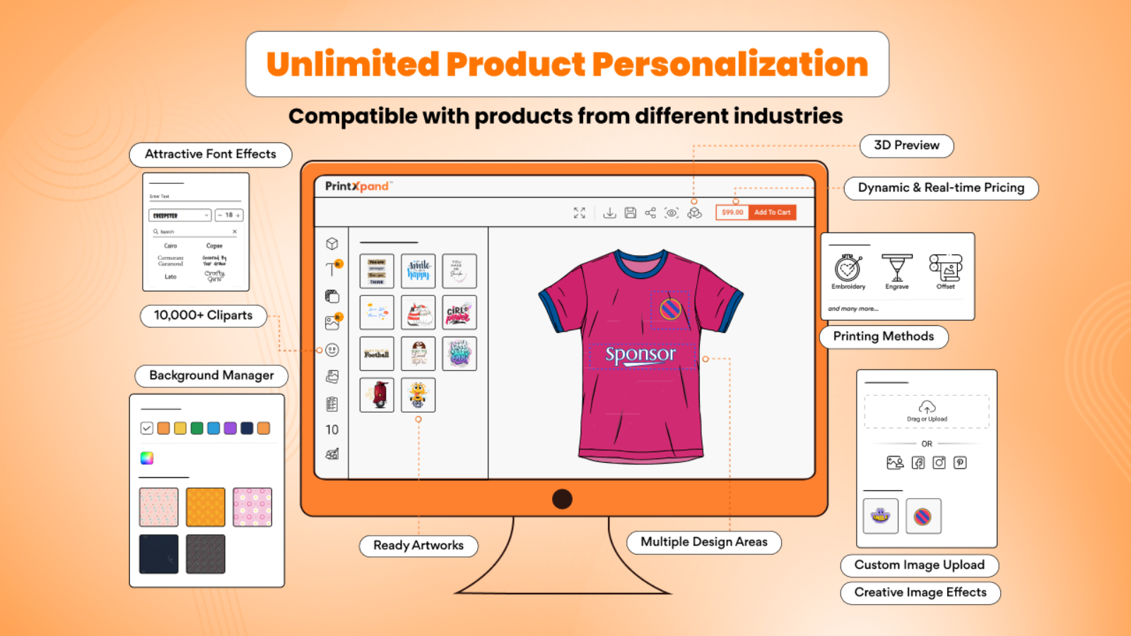 With PrintXpand product design tool, users can easily create 100% customized products while your business benefits from a fully integrated platform that effortlessly syncs products, collections, designer orders, and customer data in real-time. Allow merchants to manage customized products like apparel, packaging, promotional items, and more right from their Shopify storefront.
