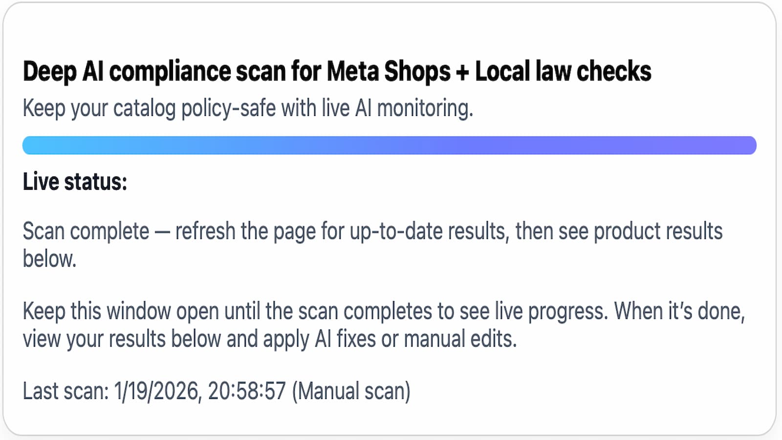 This app checks your products for Facebook Shop and Instagram Shop compliance issues. It scans product titles and descriptions for restricted items and policy-sensitive wording that can cause rejections. You can see issues per product, generate safer AI rewrites, and apply updates to your store. Manual and scheduled scans help keep your Facebook and Instagram shops compliant.
