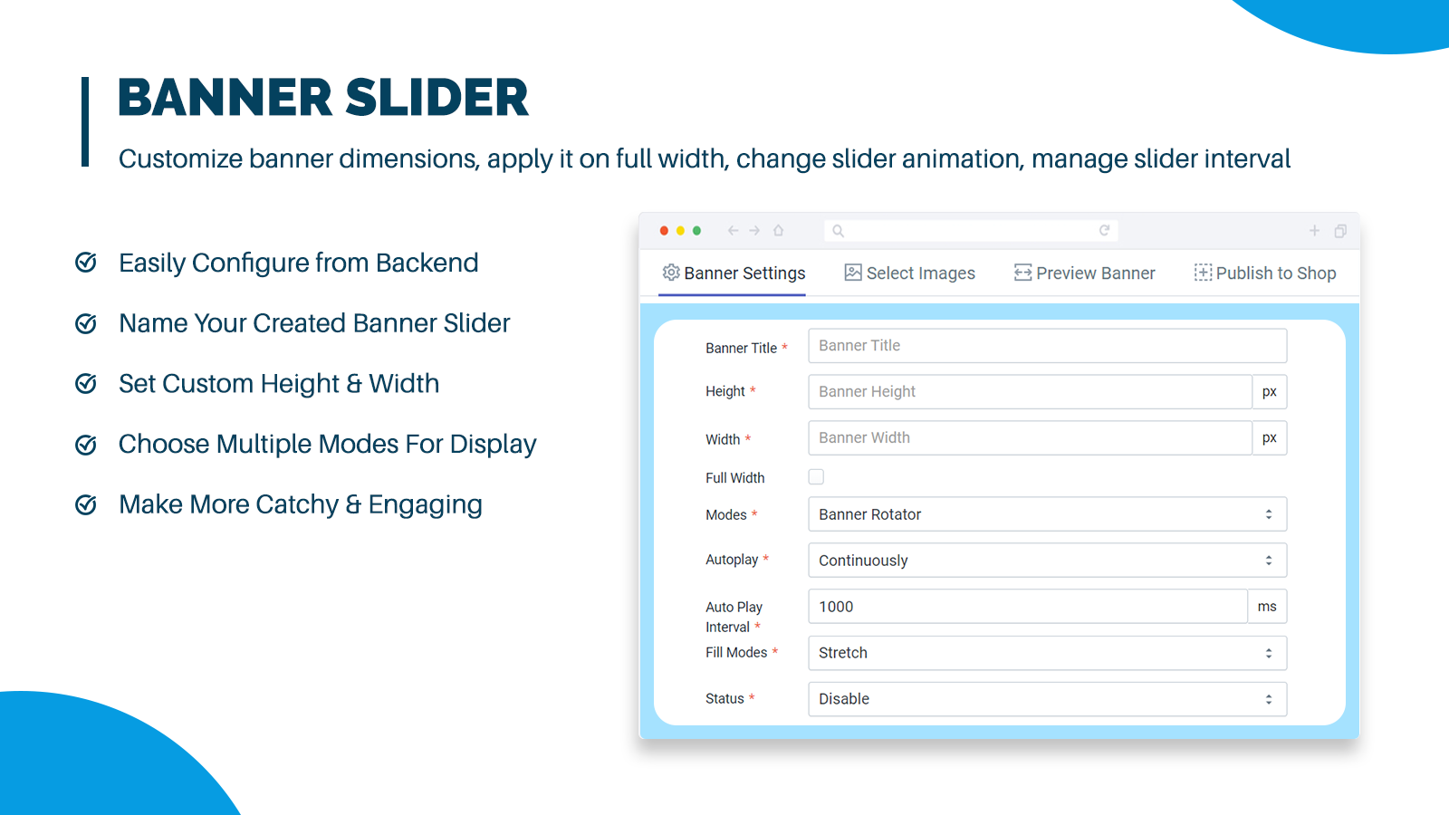 Banner slider app Increases the visual appeal of your website and highlights your featured issues, projects, and best works with the image slider. Showcase images or videos in a captivating slider layout. The banner slider app allows you to create, customize, and display a series of banners as sliders. With this Slider App, you can customize banner dimensions, apply it at full width, change slider animation, manage slider interval, custom slideshow banner size add unlimited images for display.