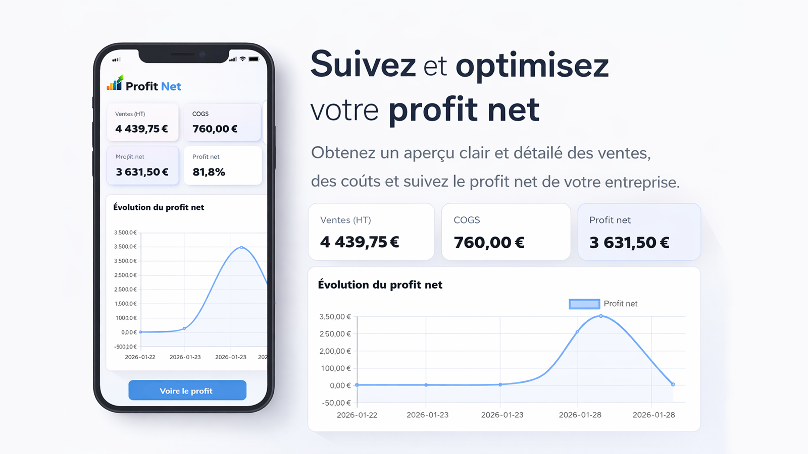 Calcule votre profit net réel (CA HT − COGS) et l’affiche en tableau de bord clair.