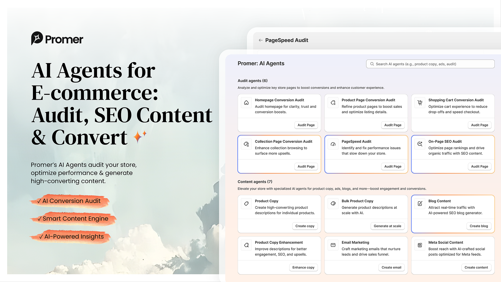 Promer’s AI audits your Shopify store to find what’s blocking sales, including layout, trust, UX, page speed, and checkout friction. It gives you clear CRO fixes and helps you create SEO blog content, product descriptions, and emails that convert. You also get built-in analytics, a PageSpeed Audit Agent to improve load time, a Cart Audit Agent to reduce friction and recover checkouts, and a Meta Content Agent for ready-to-post social content. Promer shows you what to fix and what to say to grow.
