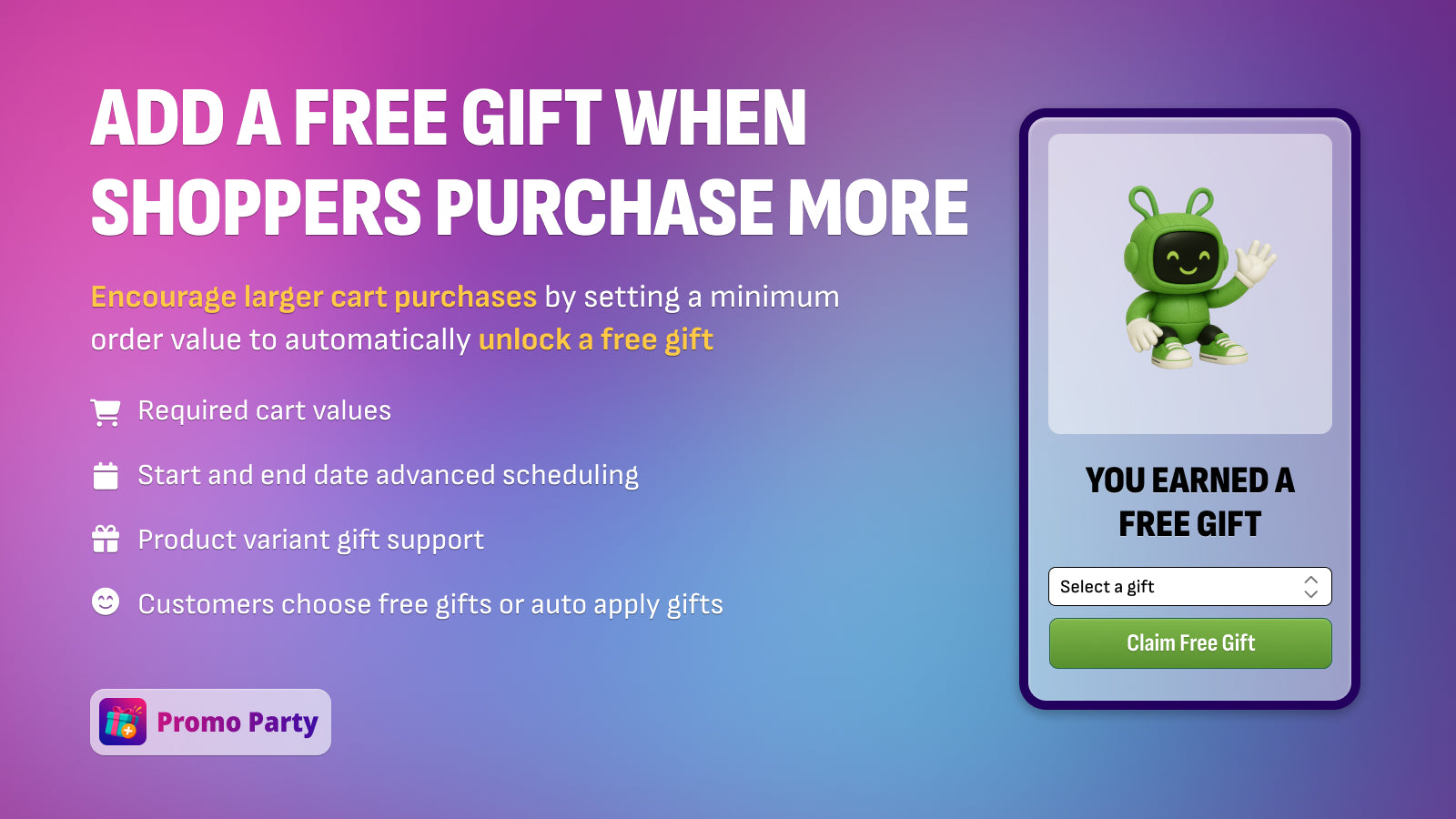 Turn every checkout into a loyalty opportunity! Offer free gifts with purchases, BOGOs, limited-time offers, bundles & incentives to increase AOV at checkout when cart rules are met with Promo Party Pro. Set custom rules like "Spend $50, choose your free gift!", schedule advanced promos with start & end dates & let shoppers pick their gift from a popup. Gifts automatically add to cart, play nicely with discount codes, & no code is required. Boost sales by offering free gifts with purchases.