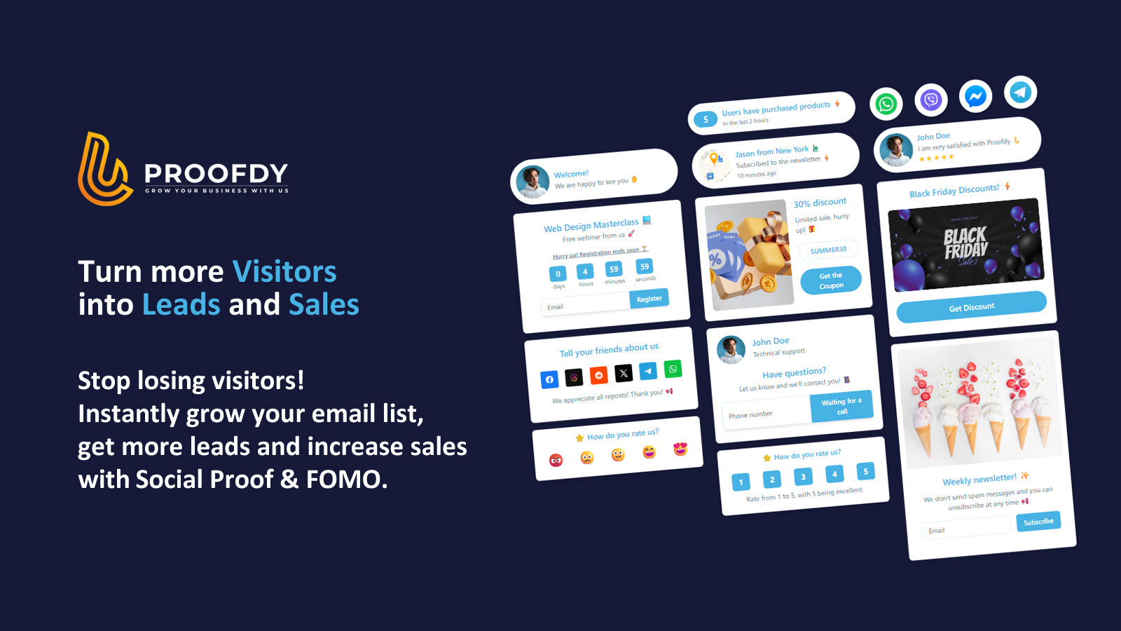 Social proof notifications: recent orders, visitor counters, reviews & FOMO widgets.