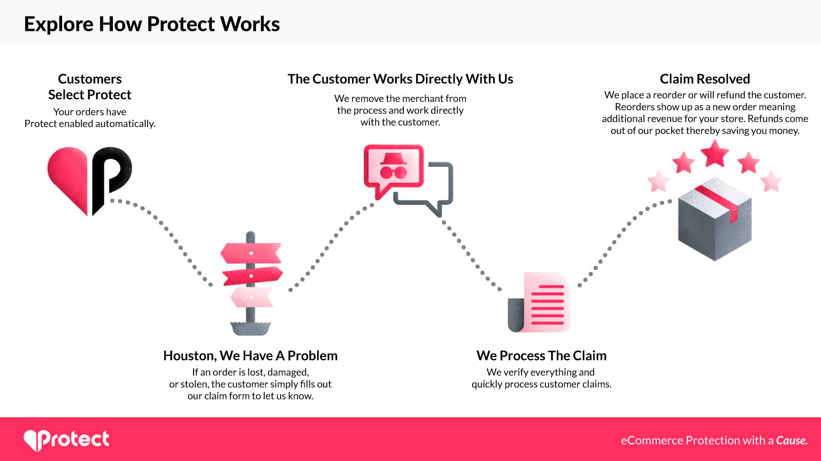 Protect has features to protect to both your shop and customers. We offer shipping, product, price, with other protections to come. Our app increases your order value and has no negative impact on conversion rate. We handle the customer service claims. You never pay for this service but instead make money when we cover claims and reorders. Most importantly, you can support your favorite causes or help the planet and enjoy shared marketing and exposure through Protect's community.