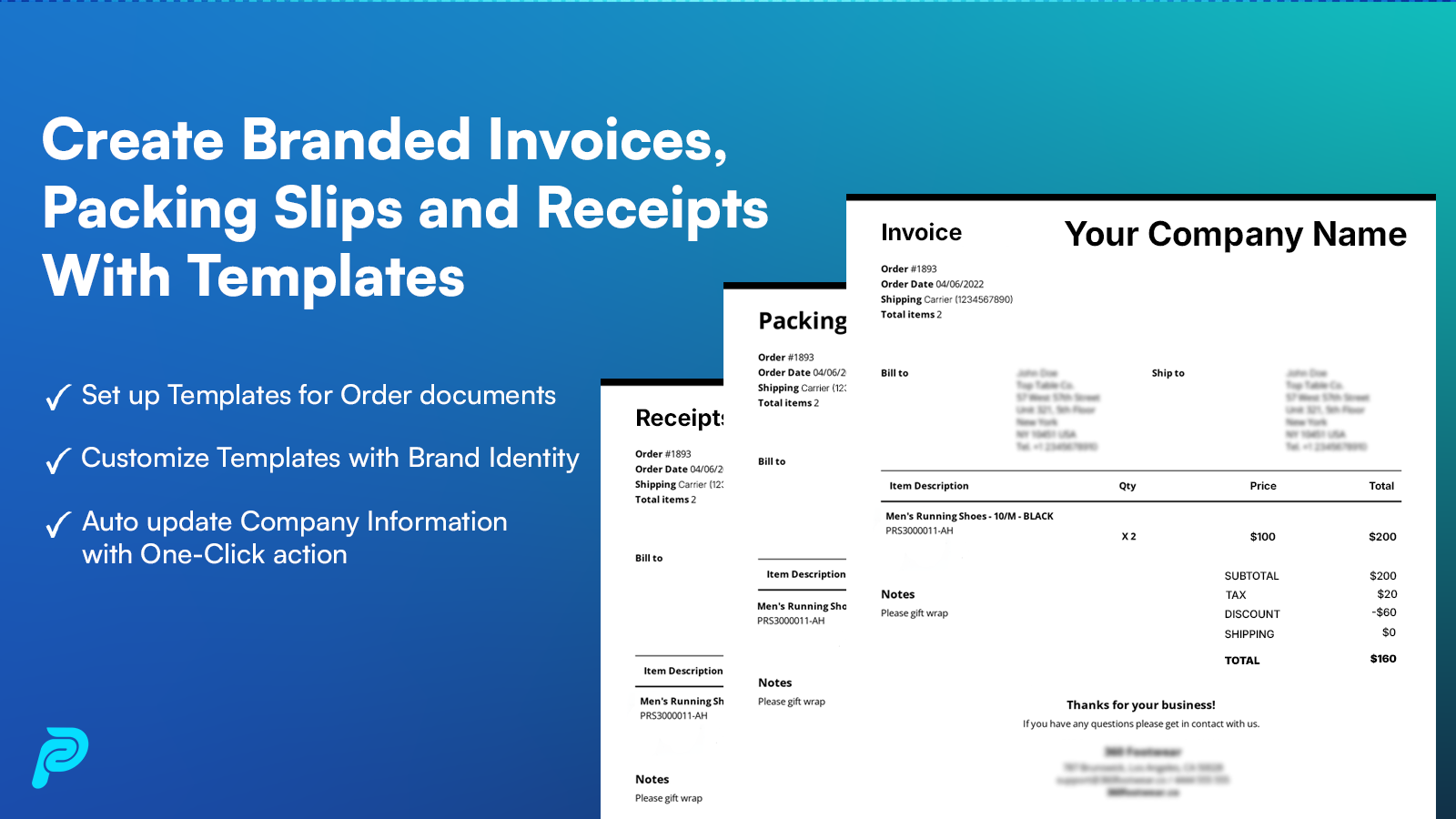Create branded invoices, packing slips and receipts with templates, automatic delivery to customers