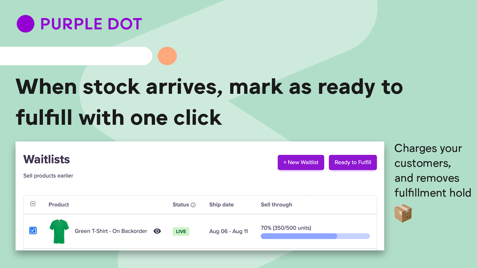 With Purple Dot, you can create end-to-end pre-order experiences to easily sell products before you have stock. Our pre-order app enables a free checkout for customers, vaults their card, and auto-charges when you are ready to ship. We also provide clear customer comms and a self-service cancel + amend tool so that your customers are fully informed on their pre-order, which helps build trust with your customers. Even if your shipping dates change, update your customers with one click.