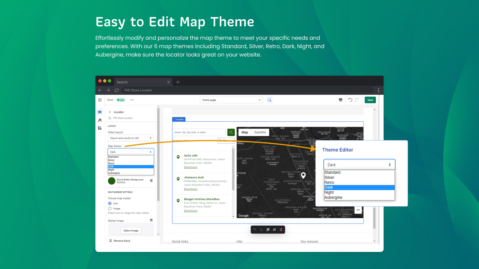 PW Store Locator makes it simple to add a store map to your Shopify store. Add an interactive and customizable store locator map to make it easy for customers to find the nearest store, view store information, and get directions. The map can be customized to fit the look and feel, making it an effective marketing tool for businesses. By using the PW Store Locator, businesses can improve the customer experience, increase foot traffic to stores, and ultimately drive more sales.