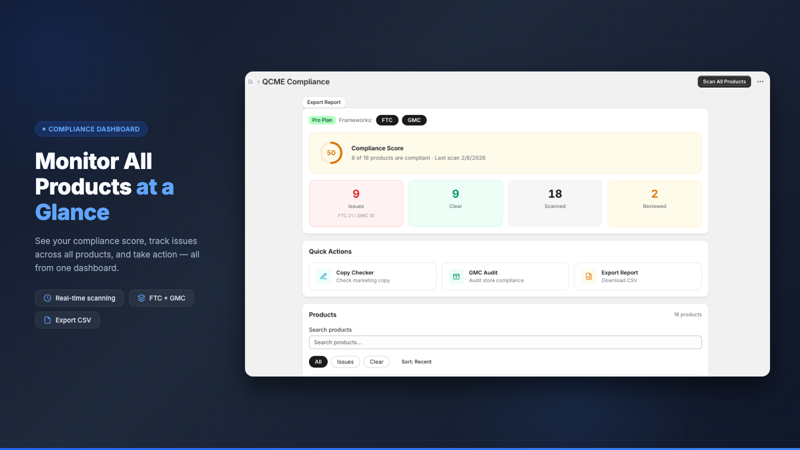 QCME scans your product descriptions and marketing copy for potential FTC and Google Merchant Center violations. The app uses AI to analyze each listing, flag issues by severity, and suggest specific fixes. Run a store-wide scan to review all products or use the copy checker to validate text before publishing. The GMC store audit checks your store policies for refund, shipping, and privacy requirements. Export findings as CSV reports for your compliance team.
