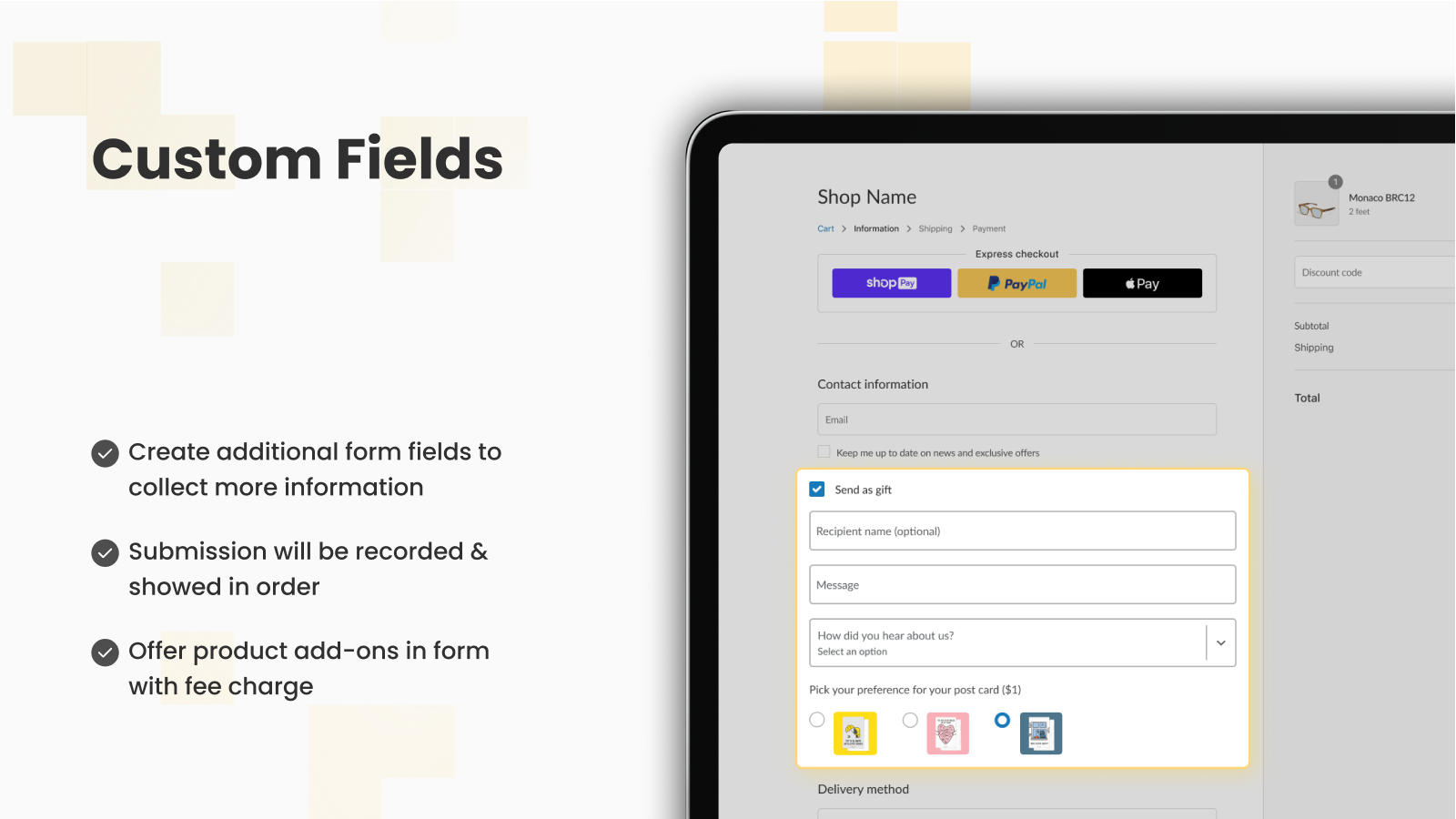 Unlock the full potential of checkout page and post-purchase process with Qikify Checkout Customizer: Customize checkout fields - Upsell in checkout with discounts - Elevate checkout page with various checkout blocks - Migrate Checkout liquid & Script to the new Checkout Extensibility. With 10+ checkout and post-purchase extensions built with Shopify Functions, you can easily achieve these goals with our support! Additionally, fully compatible w/ Shopify B2B, Markets, multi language & currency.