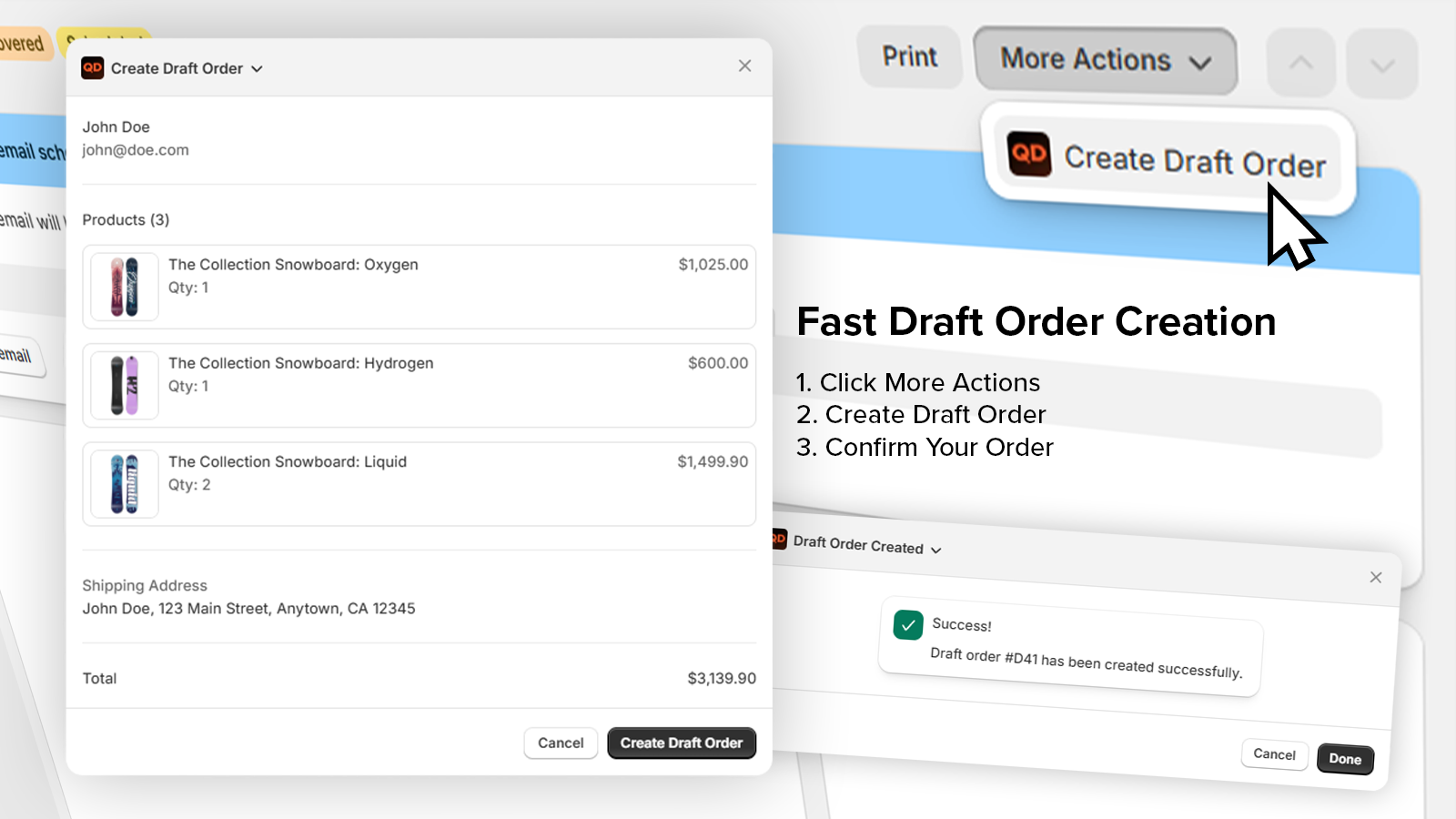 Quick Draft is a simple tool that gives you the ability to create draft orders from abandoned checkouts. Sometimes a customer fills up their cart, but gets stopped at checkout because they want to do a transaction with the merchant individually. This means the merchant has to create a new order, based on the checkout. Quick Draft fixes that problem. Ideal for B2B merchants and wholesale businesses that need quick order recovery. Turn abandoned carts into draft orders with one click.