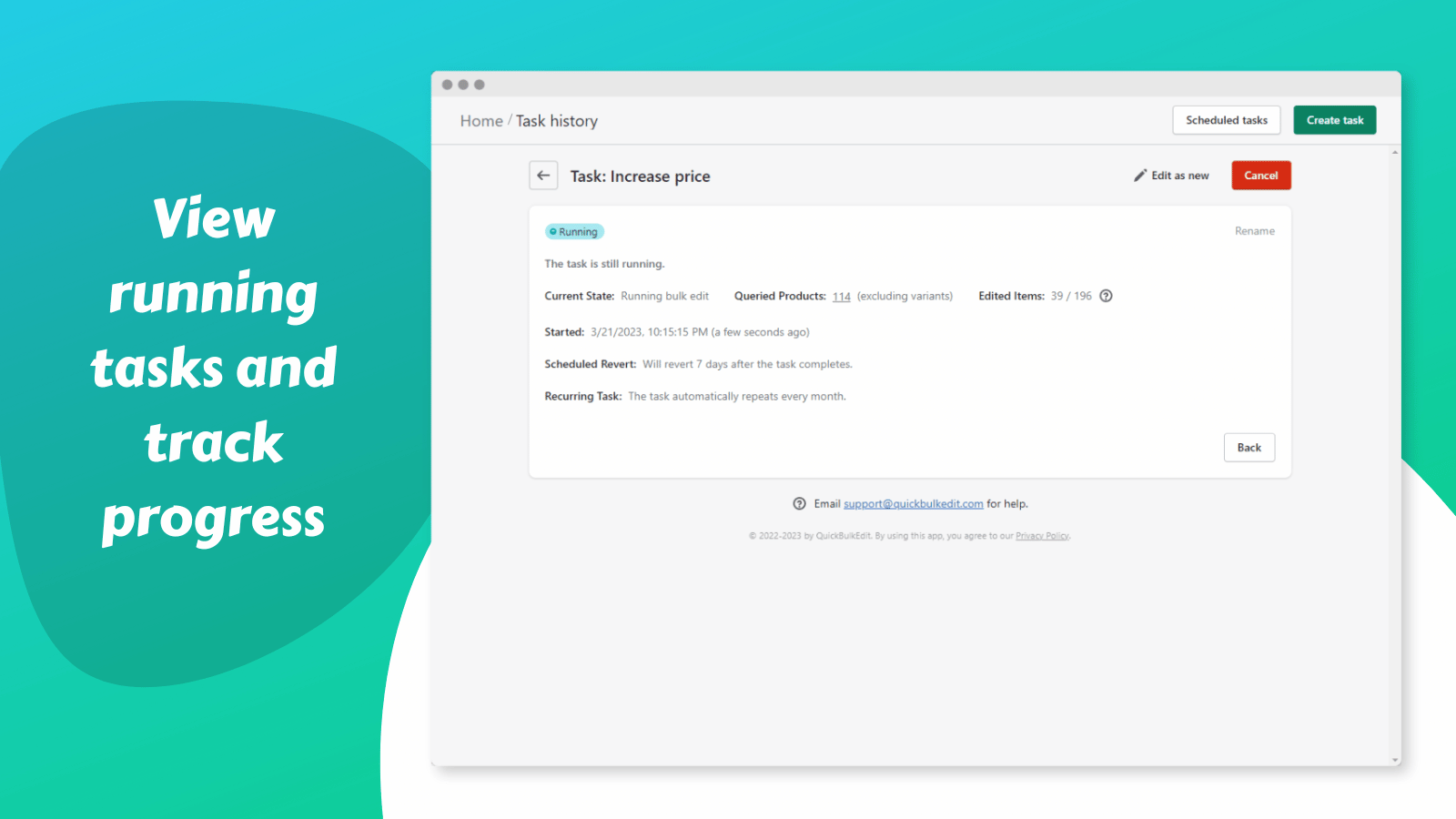 With this bulk edit app, you can quickly and easily edit many products or variants at once, saving you hours of tedious work. Bulk edit a variety of product or variant fields, such as descriptions, titles, tags, prices, inventory, and more. You can also easily add, remove, and sort product options (variants). Create scheduled edits in advance and automatically revert the changes later if necessary. Never worry about making a mistake, as you can simply revert each task to undo the changes.
