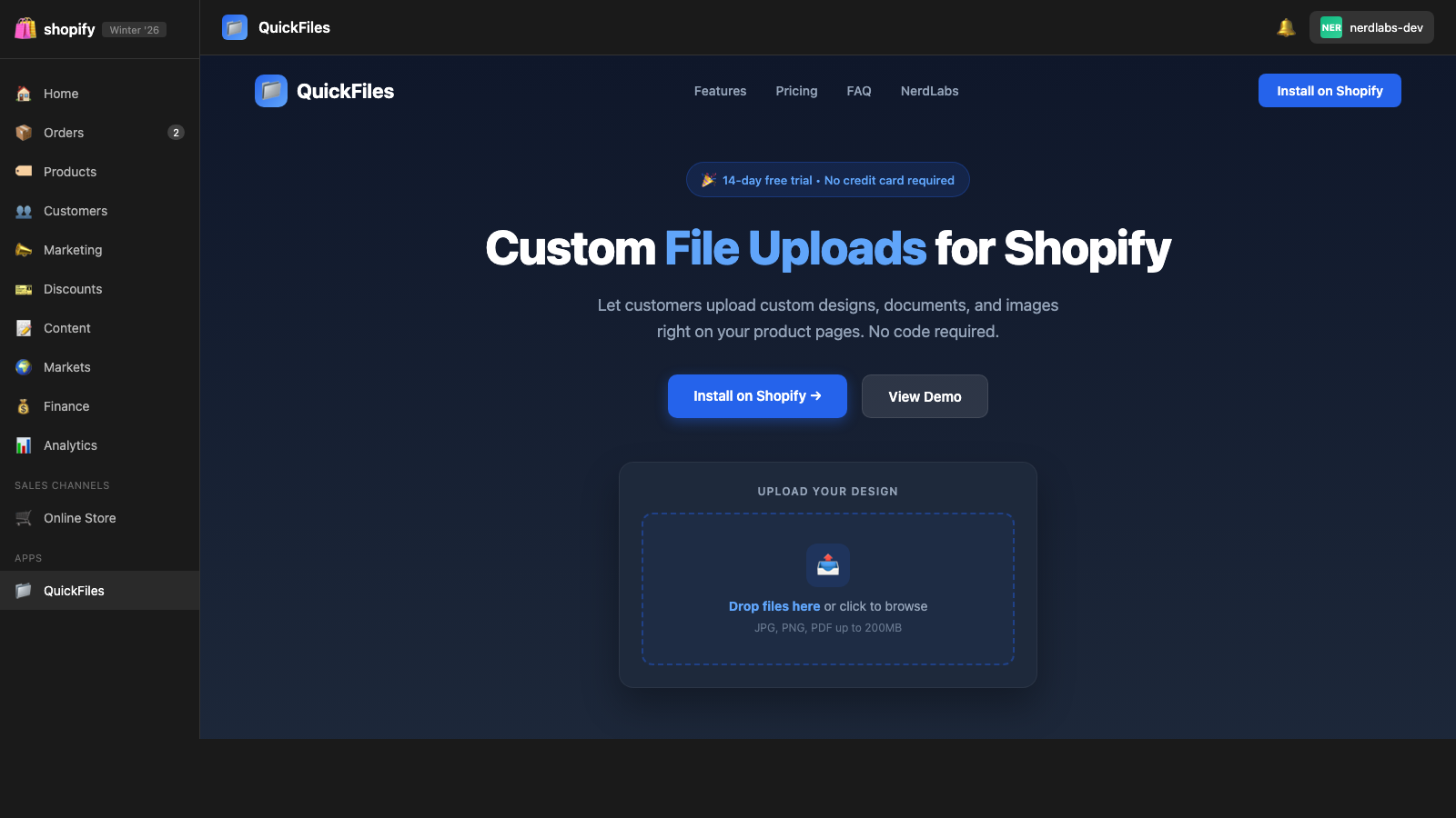 QuickFiles is an easy way to add file upload fields to your Shopify store. Whether you sell custom t-shirts, personalized gifts, or print-on-demand products, QuickFiles makes it easy for customers to upload their files on the product page. Supports JPG, PNG, GIF, PDF with built-in image cropping, and more. Set up upload fields in minutes with smart product targeting by tag, collection, or specific products. Files upload directly to our servers for reliable global cloud storage.