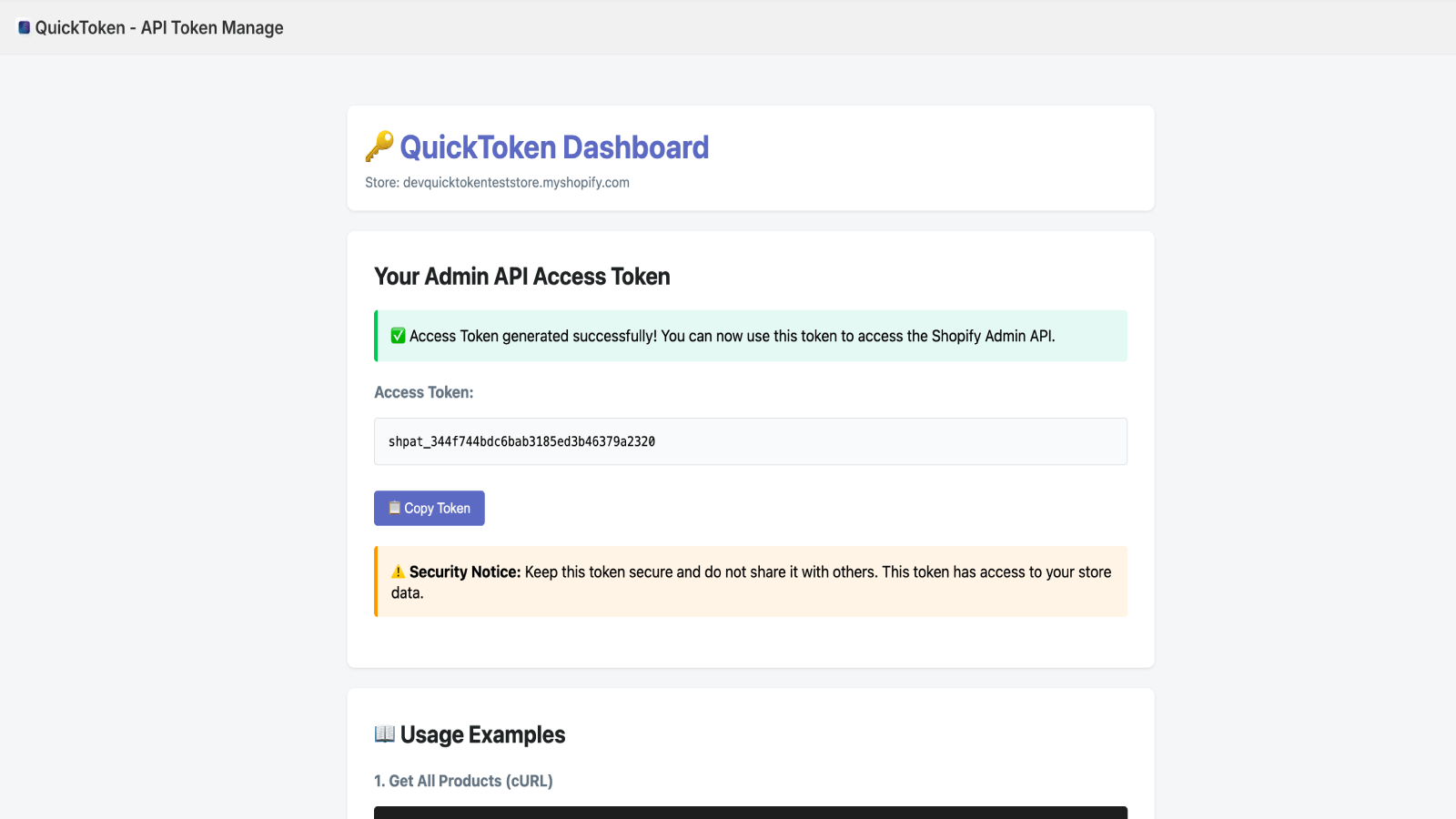 QuickToken streamlines Shopify Admin API access for developers. Instant token generation with ready-made code examples in cURL, JavaScript, and Python. Perfect for building integrations, automating workflows, or testing endpoints. Setup takes less than a minute - install, authorize, and your token is ready to copy and use. QuickToken gives you the fast, secure API access needed to create exceptional Shopify solutions.