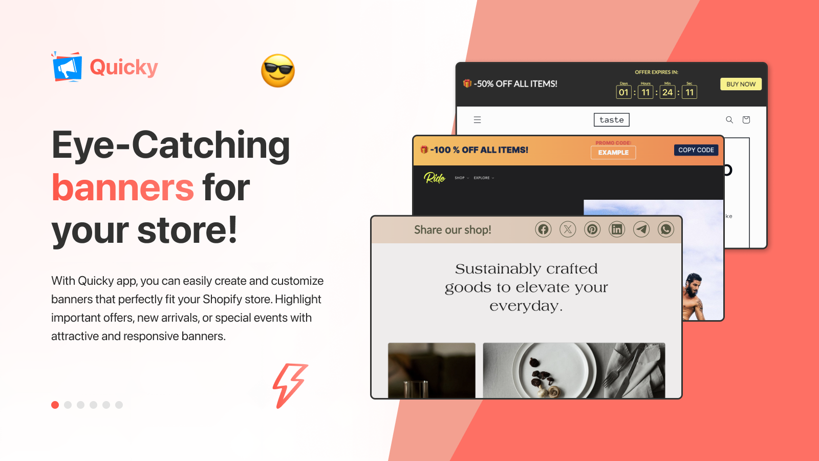 Just one app for onsite marketing allows you to create and add high-converting bars and banners to your store. A lot of promotion banners are available - easy setup and flexible customization from simple banners to a slide show. Multi Announcement Banner Slider, Action Bar, Single Announcement Bar, Sales Motivation Bar, Email Sign-up Bar, Coupon Bar, Free Shipping Bar, Countdown Timer Bar, Cookie Consent Bar, Add To Cart Bar, Global Location Bar are ready to boost your sales!