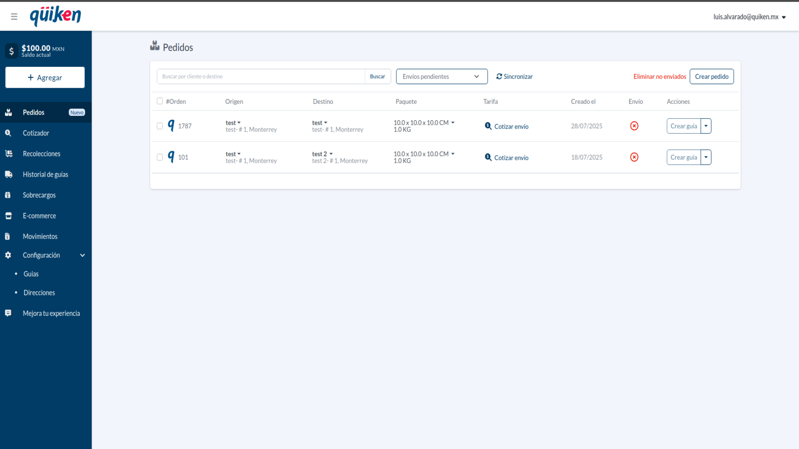 Quiken reúne todas tus soluciones de envío en una sola plataforma. Cotiza al instante, compara tarifas y genera guías en segundos, aprovechando precios preferenciales y la cobertura de los principales transportistas como Estafeta, Sendex y Quiken. Lo que Quiken hace por tu negocio Gestión de envíos de principio a fin Crea, sincroniza y rastrea cada envío desde un panel intuitivo y centralizado.