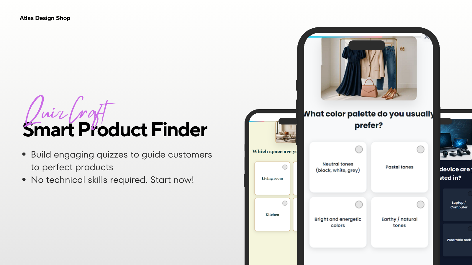 Create interactive quizzes that recommend products with smart filters and match scores. Choose from 4 built-in themes (Technology, Home, Beauty, Skincare), drag & drop editor, animated drawer interface, and customizable buttons. Show product match percentages across collections to climb engagement and conversions. Launch a personalized, modern quiz in minutes!