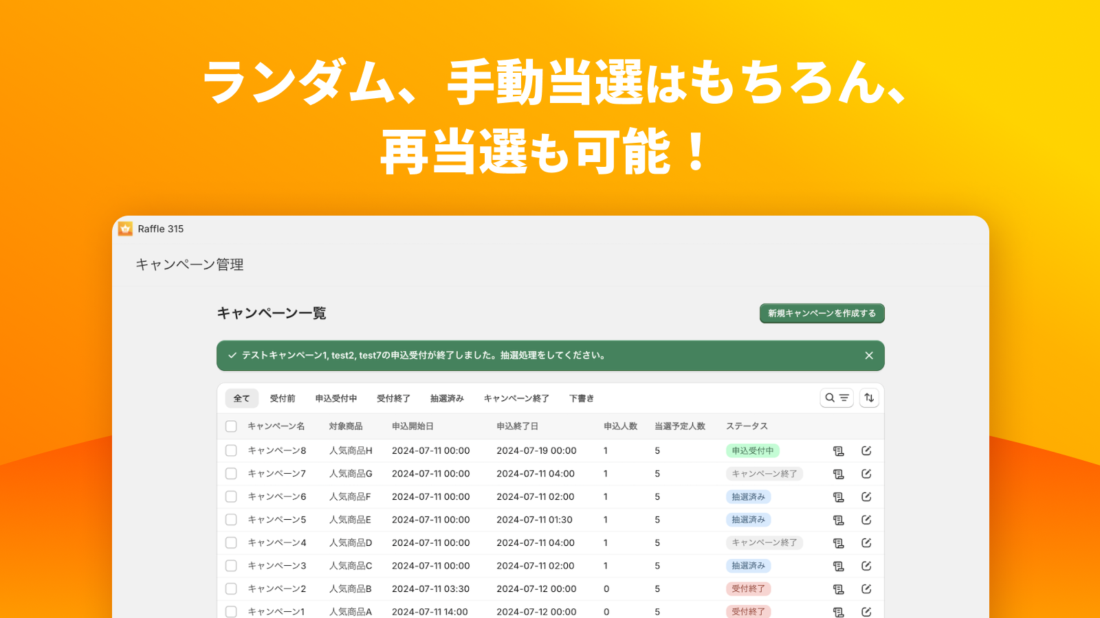 Raffle 315は抽選販売ができるアプリです。人気商品の購入希望者から申込みを受付け、抽選により当選者を確定させ商品を購入していただくことが可能です。