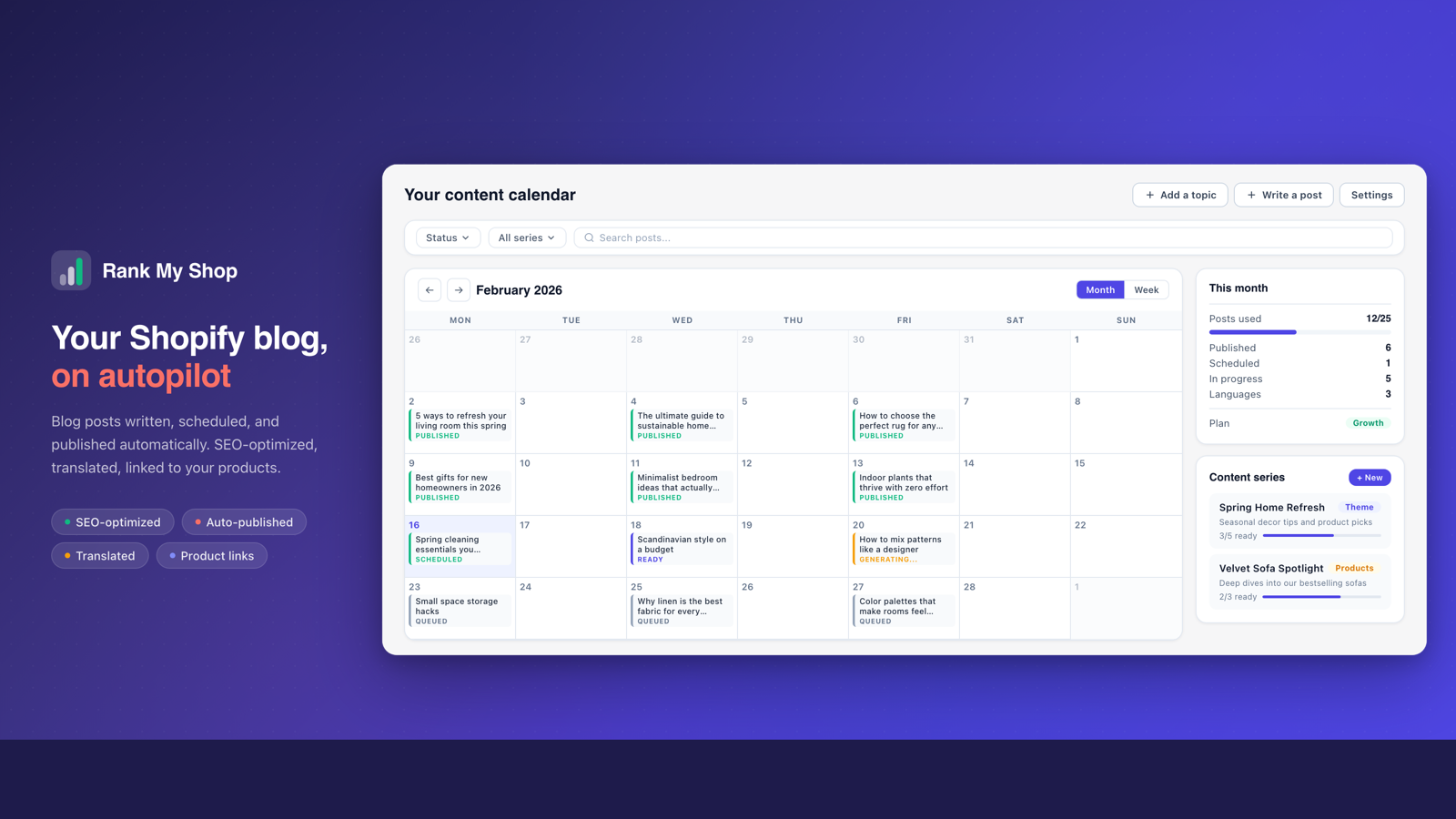 Most Shopify merchants know blogging drives traffic, but who has the time? Rank My Shop handles it for you. Tell us your niche and products, pick a schedule, and we write original blog posts that link to your products, include images, and follow SEO best practices. Every post is translated into your store's languages through Shopify's native translation system. Review posts on a calendar before they go live, or let them publish on autopilot. Your content is always unique to your store.