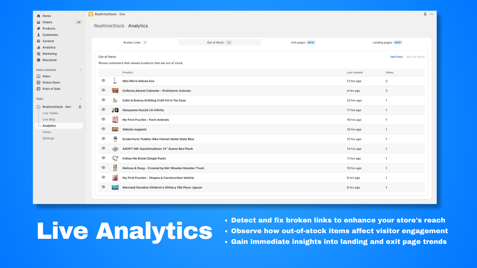 RealtimeStack offers live visualization of your customers' actions and behaviors. It provides real-time insights into your store's activities, eliminating the need for digging through lengthy reports or data analysis. With RealtimeStack, you can track customer activity, such as items viewed, searches made, cart additions, checkouts, and instances when a cart is abandoned. It further enables you to identify broken links and gather information on views of out-of-stock products.