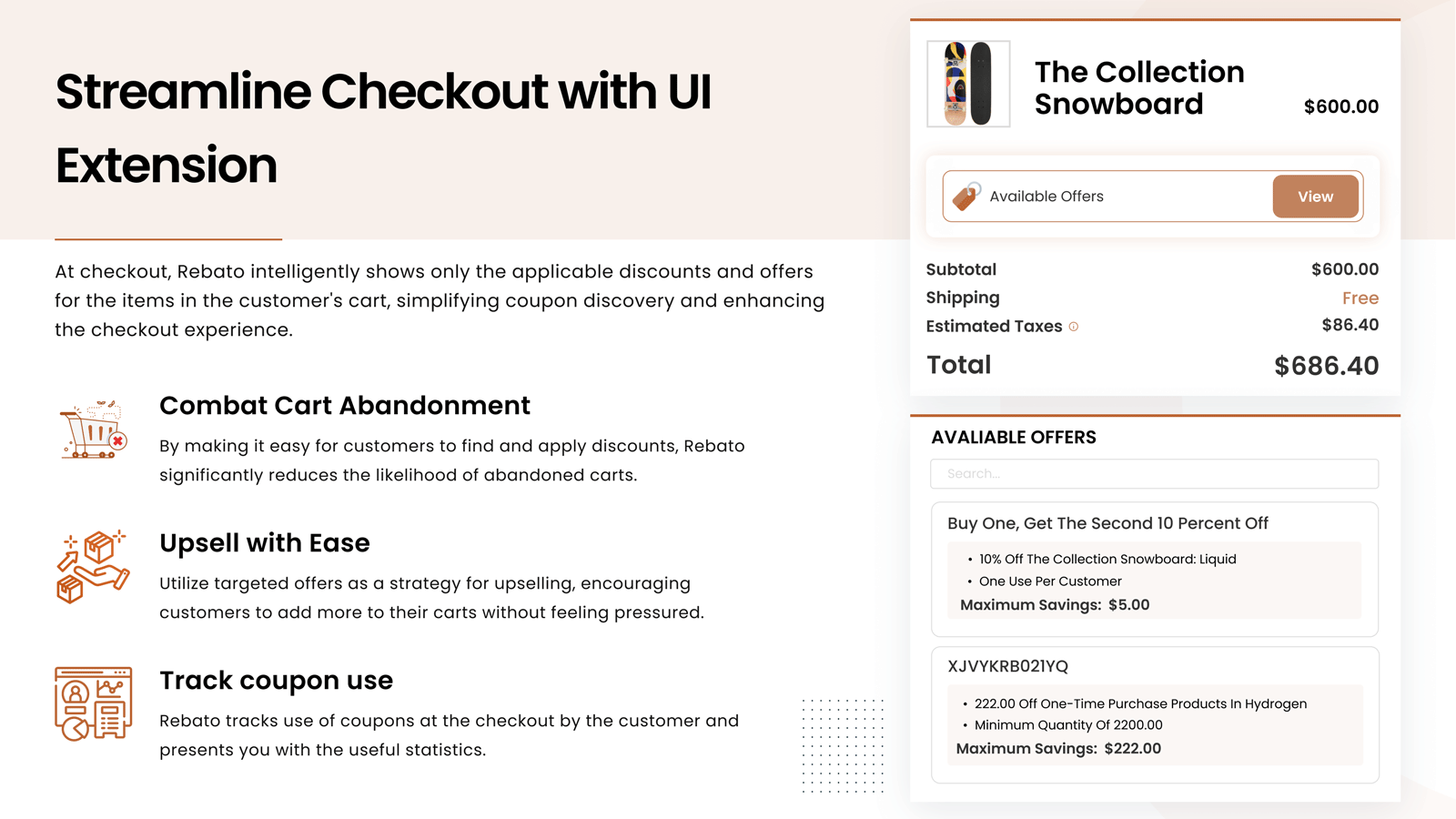 Rebato streamlines your customer's shopping experience by showcasing available offers directly on product pages, and at checkout, making it easier for them to apply discounts seamlessly. Designed for merchants looking to simplify the discount application process, Rebato is especially beneficial for stores aiming to minimize cart abandonment & enrich the checkout experience. While all Shopify merchants can benefit, Rebato offers exclusive features for PLUS stores, enhancing functionality.