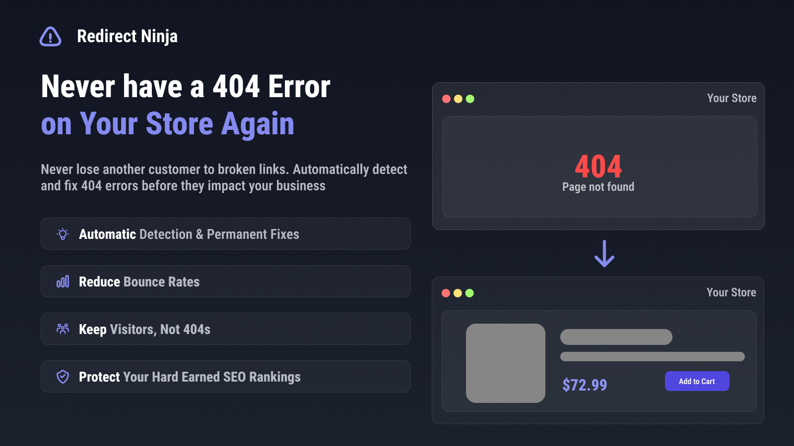 Stop losing sales! Fix 404s, preserve SEO ranking, preserve revenue with smart, easy redirects