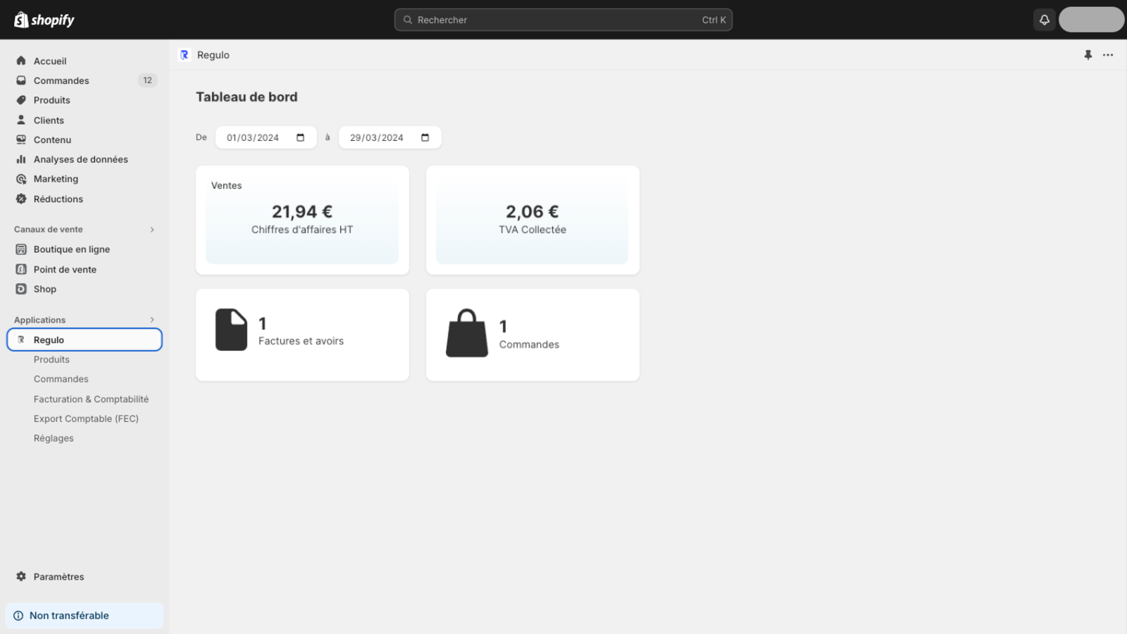Regulo génère des factures de vos commandes et des avoirs distincts sur vos remboursements avec une TVA vérifiée à chaque étape. Facile à utiliser, Regulo vous permettra d’automatiser la facturation pour continuer à gérer votre entreprise sans risque fiscal, sans interruption et en toute conformité avec l'administration Française et Européenne. Regulo vous permet aussi d'exporter des fichiers export comptable (FEC) de vos ventes, intégrables en comptabilité en 2 clics sans retraitement manuel.