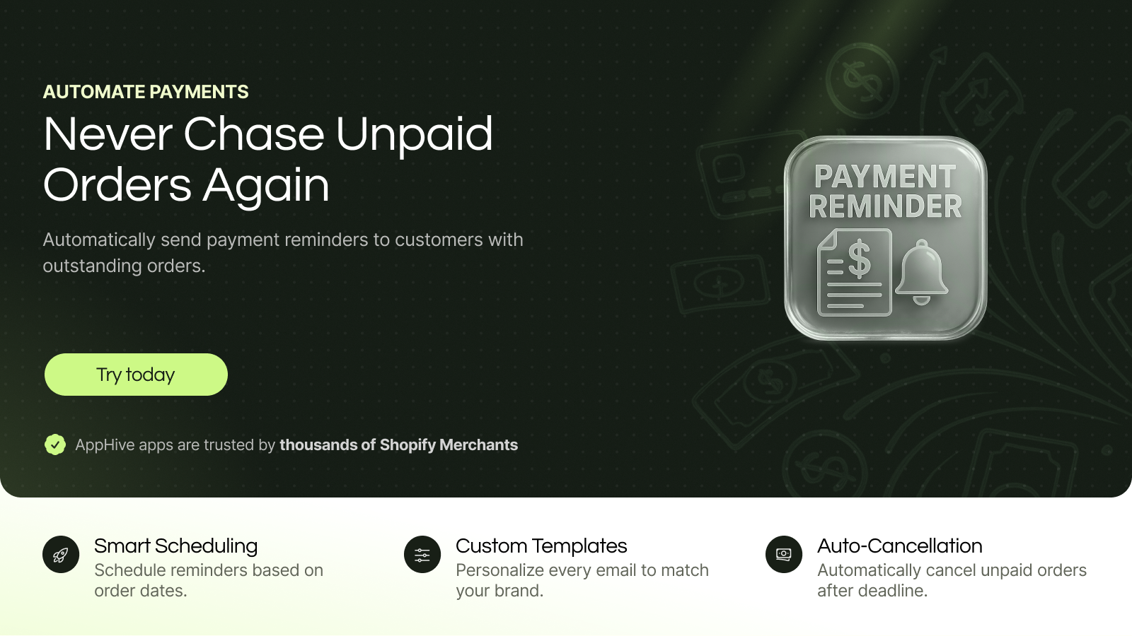 Recover unpaid orders and drafts with automated reminders, smart filters, and optional auto-cancel.