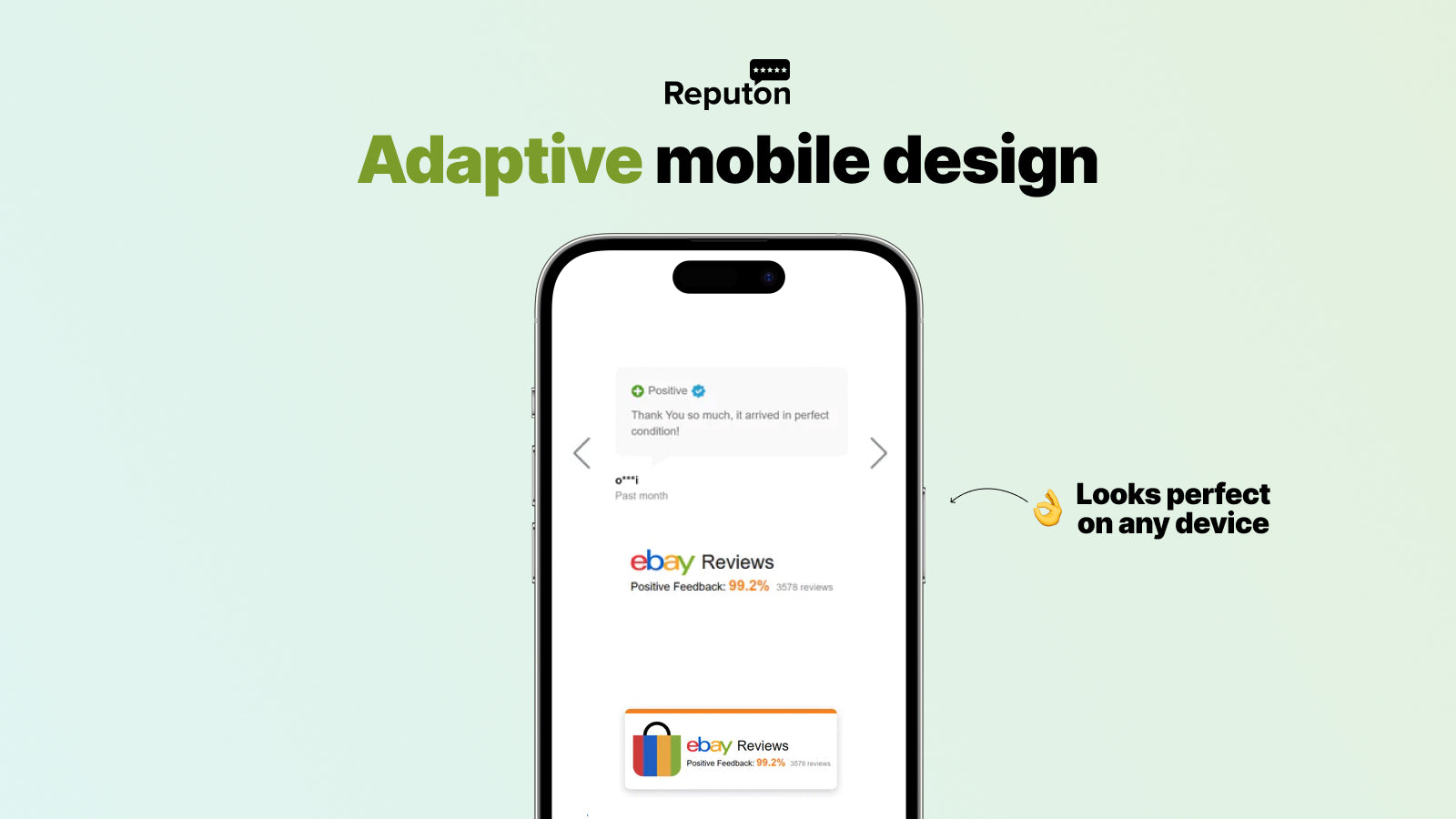 Reputon Ebay Reviews app for Shopify will help you dramatically improve your site trust, reputation and social proof by displaying awesome rating widgets on your website. Add eBay Reviews to your Shopify website in one click. No code is required. Just link your business on Ebay seller page. Import reviews easily. Place Ebay widget on any part of your Shopify store page.