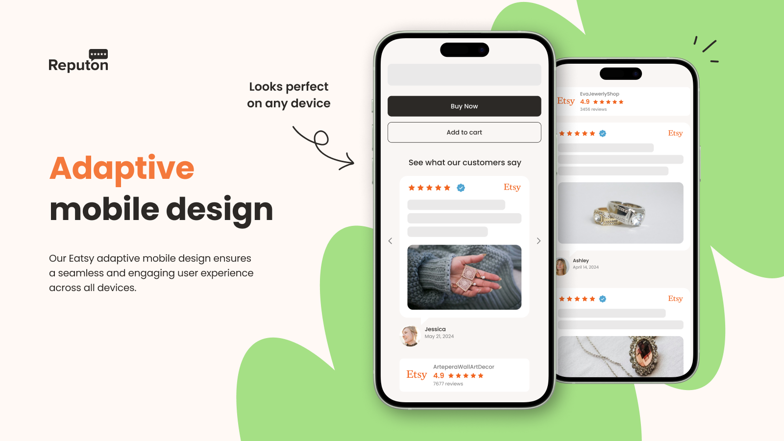 Reputon Etsy Reviews app for Shopify will help you dramatically improve your site trust, reputation and social proof. Earn more with the Etsy 4% Share and Save link. Add Etsy Reviews to your Shopify website in one click. No code is required. Just link your business on Etsy seller reviews page. Import reviews easily. Place Etsy widget on any part of your Shopify store page. Get social proof and sales with 5* reviews on Etsy seller page. Easy Etsy integration for reviews & Etsy import.