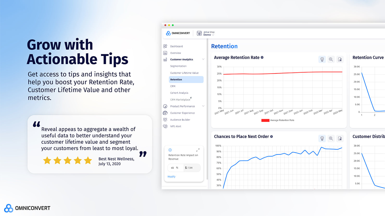 Omniconvert’s Reveal highlights your best options for generating new growth in terms of acquisition, retention, and customer loyalty. You can use it when you need to experiment and fix your business model, as well as when you're searching for an advanced eCommerce approach to reach your business targets and save time. It also empowers you to up your game and monitor what matters to save your team's time and make better decisions.