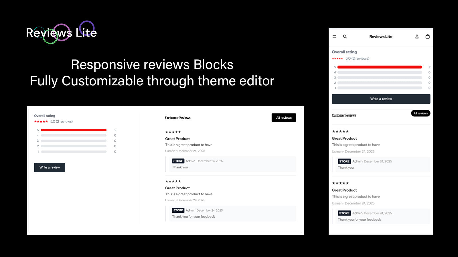 Reviews Lite helps merchants add lightweight product reviews and star ratings to their store. Display ratings on product and collection pages, manage and moderate reviews, and import or export reviews easily. The app is designed to feel native to Shopify and avoids unnecessary features, making it a simple and affordable review solution that helps build trust and support purchasing decisions.
