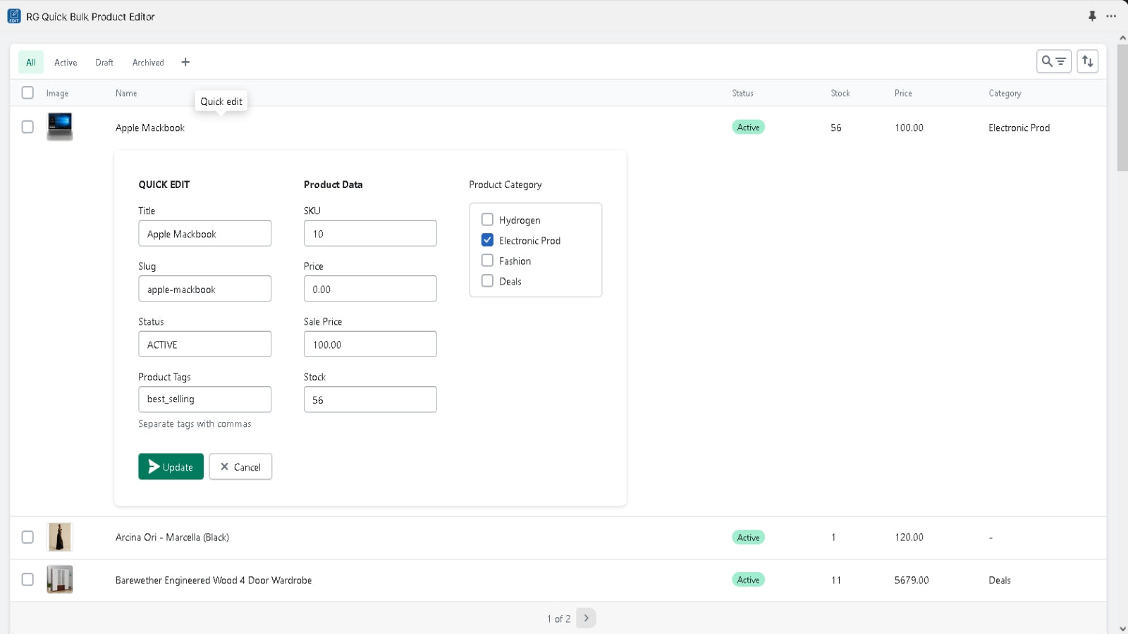 RG Quick & Bulk Product Editor is a powerful app designed to simplify product management. Effortlessly edit product details, prices, inventory, and more in bulk or individually—all in one intuitive interface. Save time, reduce errors, and streamline your store updates with this must-have tool for efficient store management.