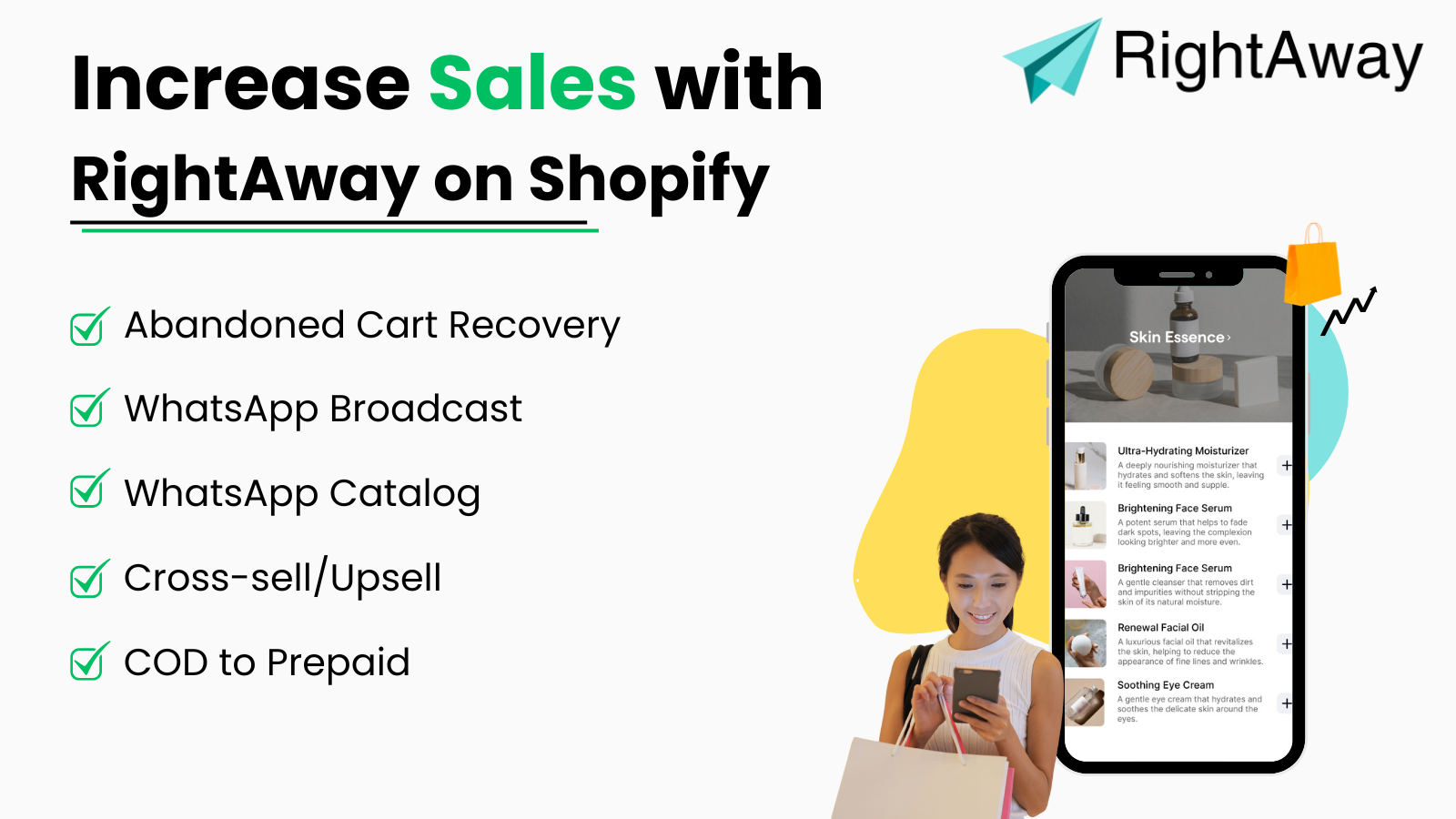 RightAway is the ideal WhatsApp marketing app for Shopify merchants who want to simplify and optimize customer engagement. With RightAway, you can run automated, personalized campaigns that drive sales and enhance customer satisfaction. RightAway’s all-in-one platform enables you to manage abandoned cart messages, order confirmations, promotional broadcasts, and customer support directly on WhatsApp. RightAway helps brands, big or small, effortlessly improve customer engagement and conversions.