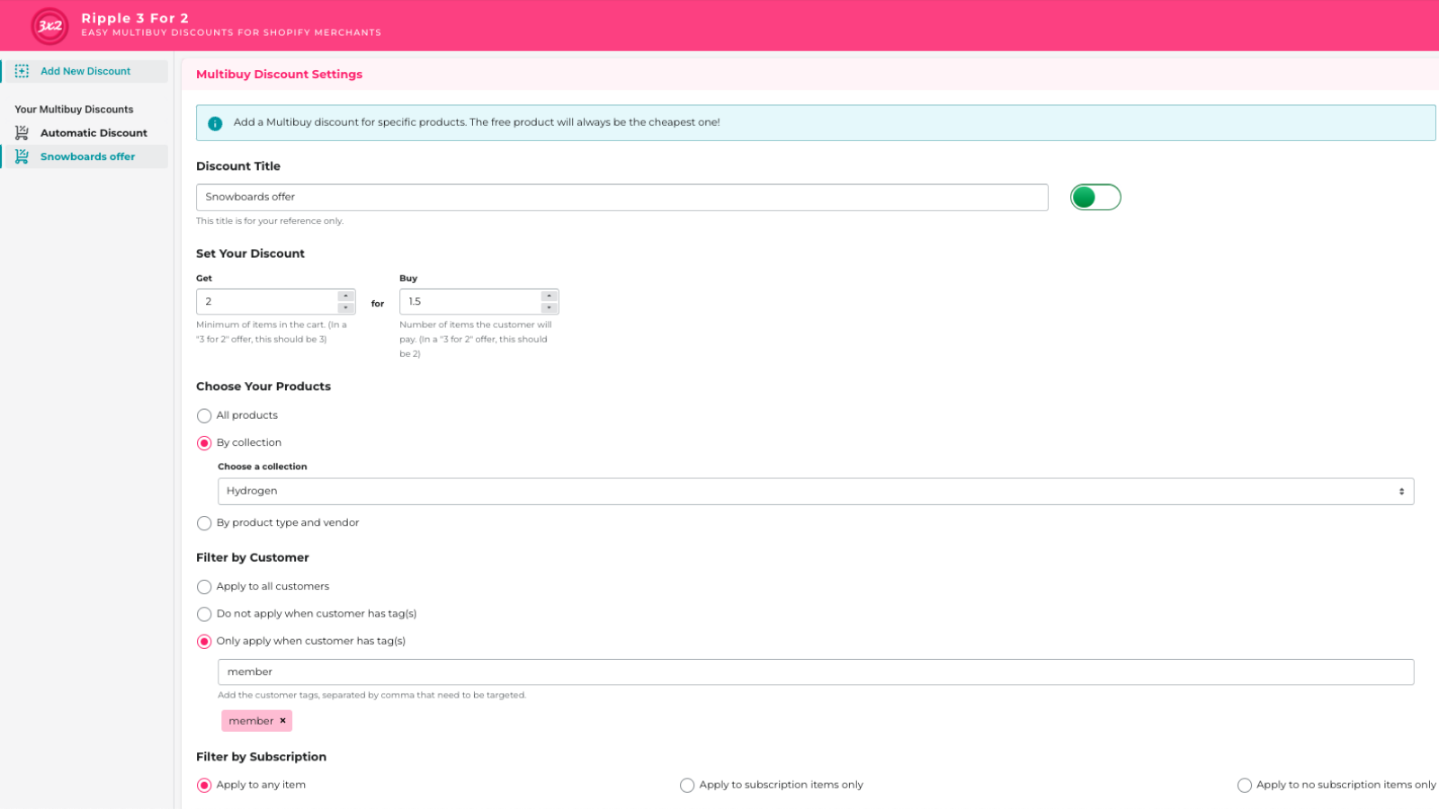 You will be able to create multibuy discounts by just adding tags such as 'chairs|3for2' or 'shirts|2for1' to your products. If adding tags does not work for you you will also be able to target products of the discount by collection, type, or vendor. Additionally, you can apply discounts to customers with certain tags. Also, exclude recurring products from your multibuy offers. Add web push notifications on the store to let your customers know they can get a discount by adding more items.