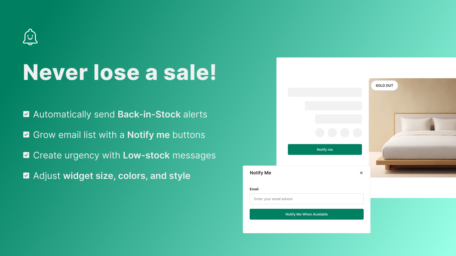 Auto-email; popup alerts; restocked notification; SMS; Klaviyo
