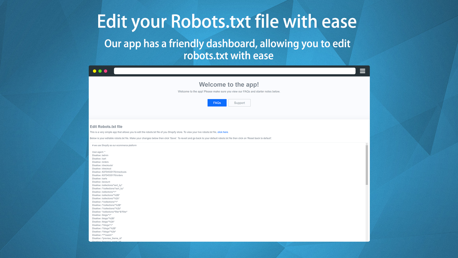 This app allows you to edit your Robots.txt file through our easy to use dashboard. By using our app you won't need to mess around with complicated code, we provide a very simple input form that shows you the current entries in your Robots.txt file. There are no need to modify your theme, handle everything through this app and be confident in the changes you make.