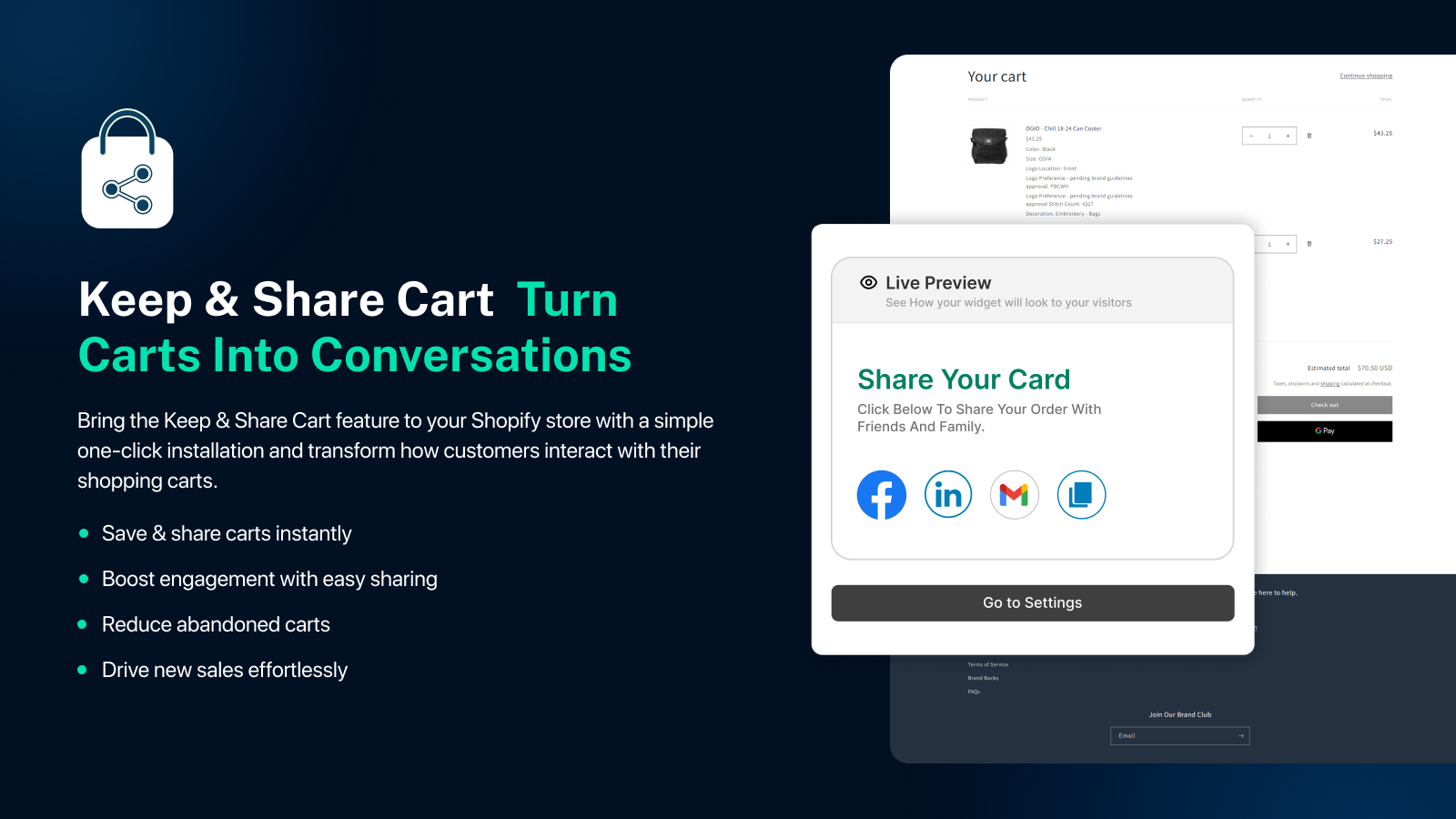 Bring the Keep & Share Cart feature to your store with a simple one-click installation and transform how customers interact with their shopping carts. Empower shoppers to save and share their carts instantly with friends, family, or colleagues, boosting engagement, reducing abandoned carts, and driving new sales.