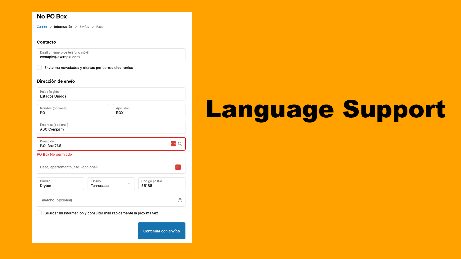 With "No PO Box", you no longer have to worry about the complications that arise after a purchase is made to a PO Box address. We detect when a PO Box address is entered and immediately display a warning on checkout. This proactive warning informs customers that your store does not ship to PO Box addresses, guiding them to provide a residential or commercial address instead.