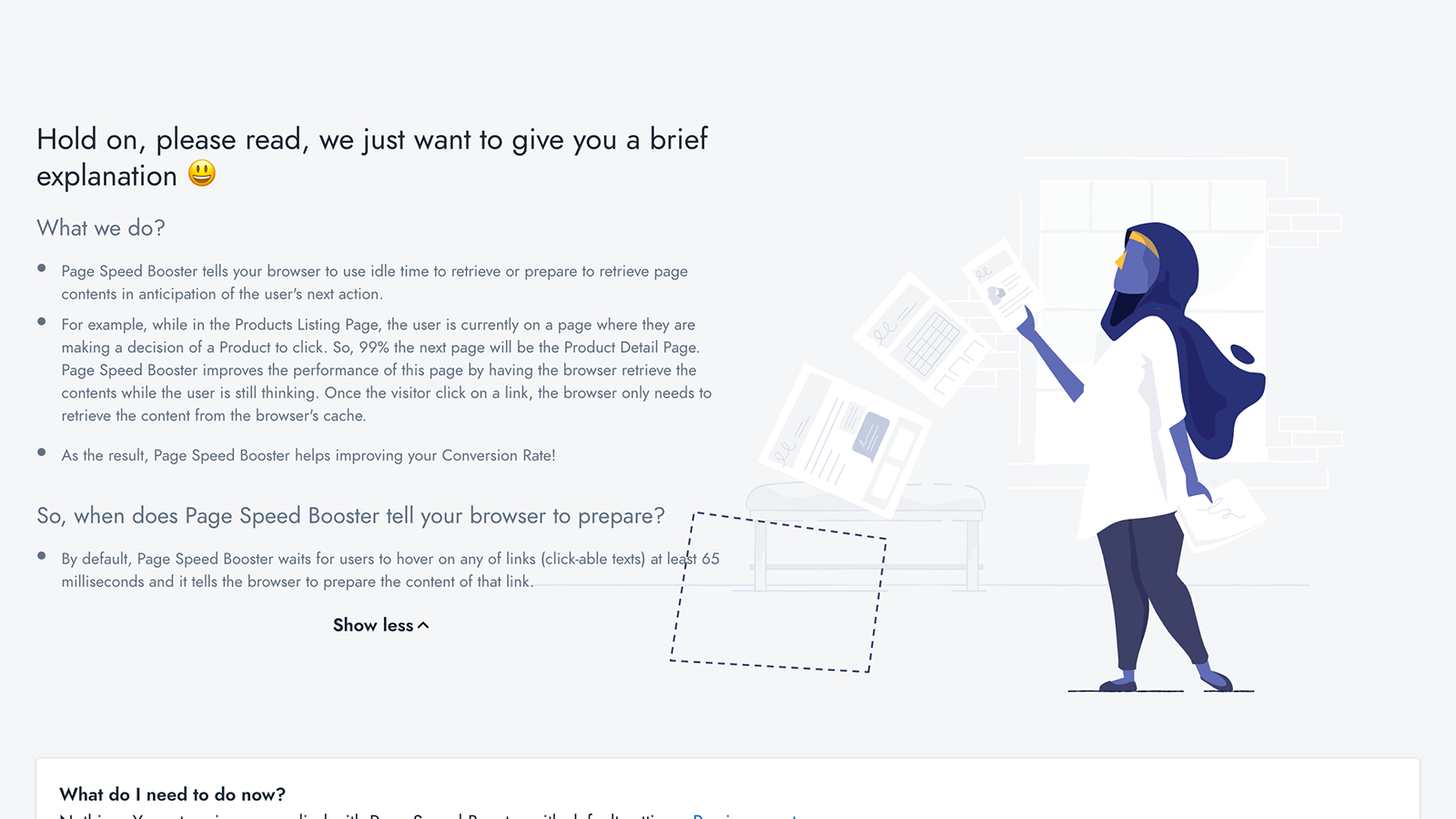 Page Speed Booster tells your browser to use idle time to retrieve or prepare to retrieve page contents in anticipation of the user's next action. As a result, Page Speed Booster helps to make your site's pages instant and improves your Conversion Rate.