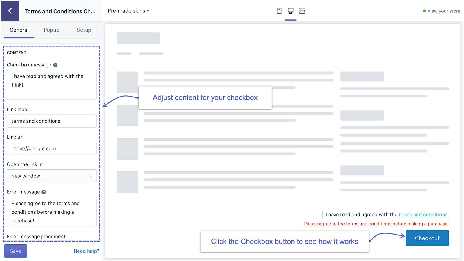 Add a terms and conditions checkbox to the cart page, so customers will be required to tick it before proceeding to checkout. If a customer doesn't tick the checkbox before clicking the checkout button, an alert with your own customized text will show and prevent them from continuing the checkout. The app will add the date and time of when the customer has ticked the checkbox and agreed to your terms and conditions to the order details under the 'Additional Details' section of the order!